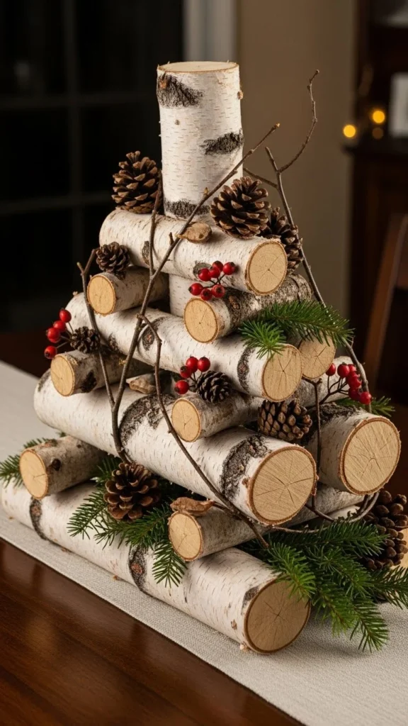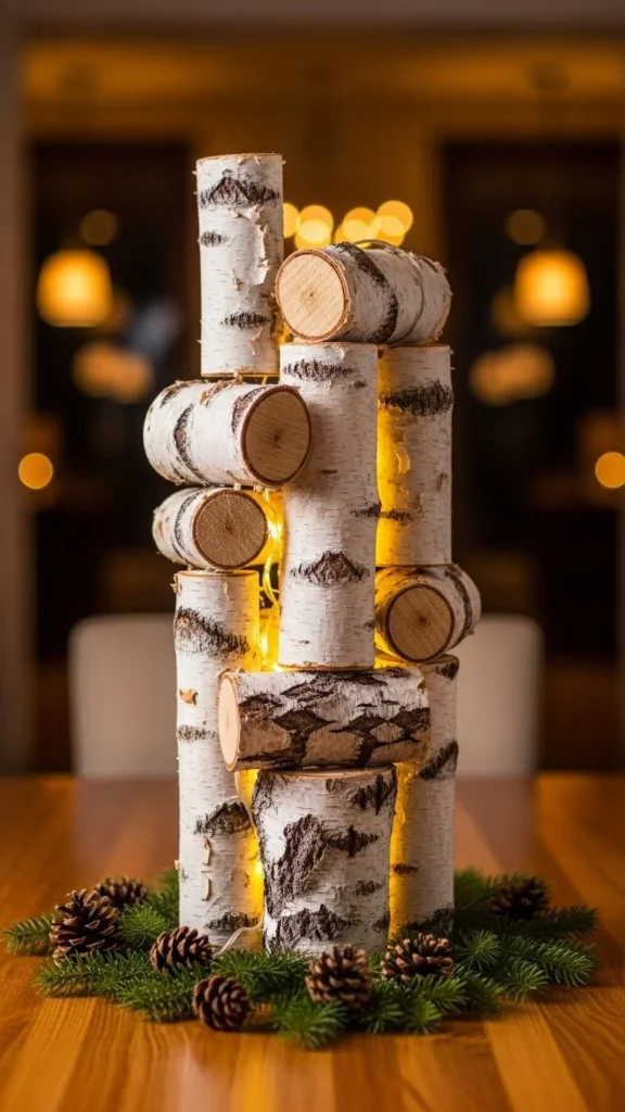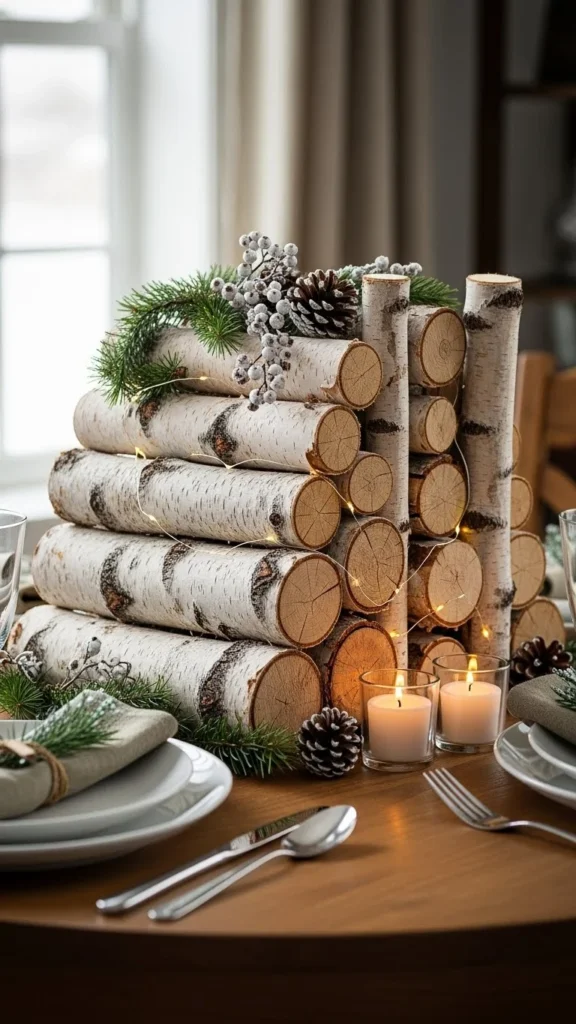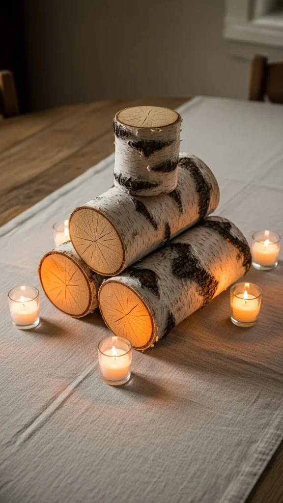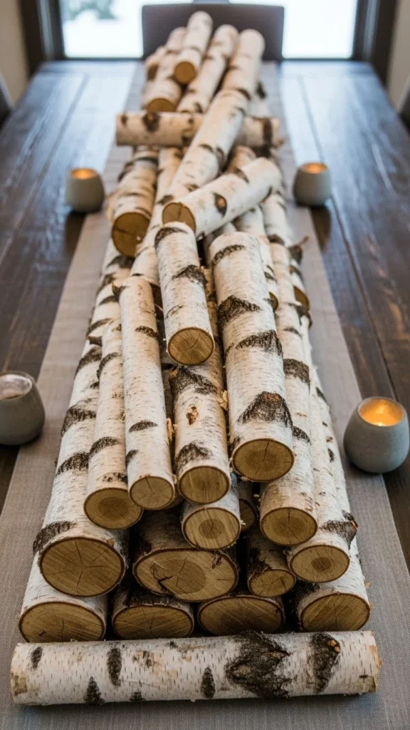 A runner-style stack uses smaller log sections placed end to end. This works well on long tables. Keep spacing tight. Avoid adding too many accessories. The logs themselves carry the look.