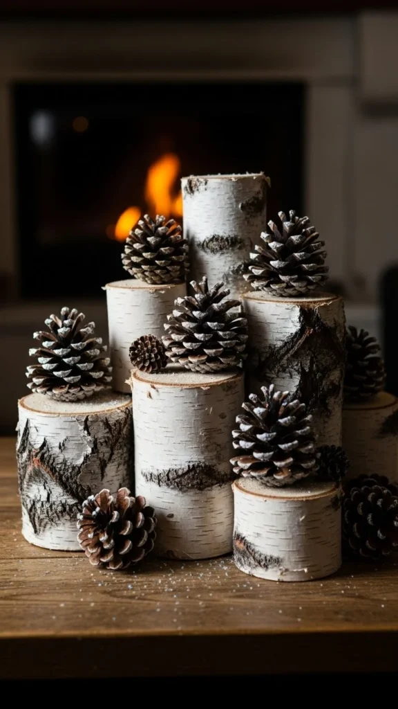4. Birch Log Stack With Pinecones