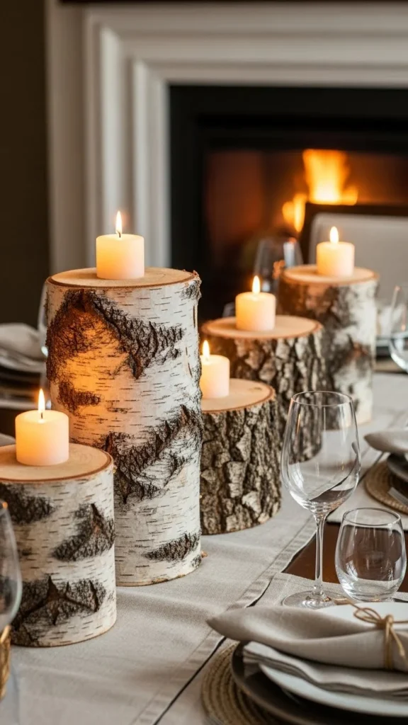 Pairing logs with taper candles adds warmth. Place candles beside the stack rather than on top. Use simple holders in metal or wood. Keep candle height moderate to avoid overpowering the table. This setup works well for dinners and everyday winter meals.