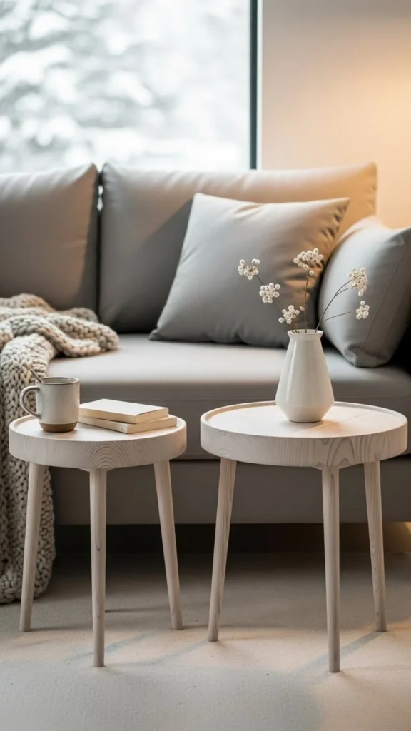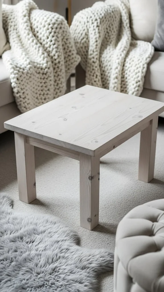 A bleached white pine coffee table adds structure without darkening the room. The light tone works well with thick rugs and soft seating often used in winter.
