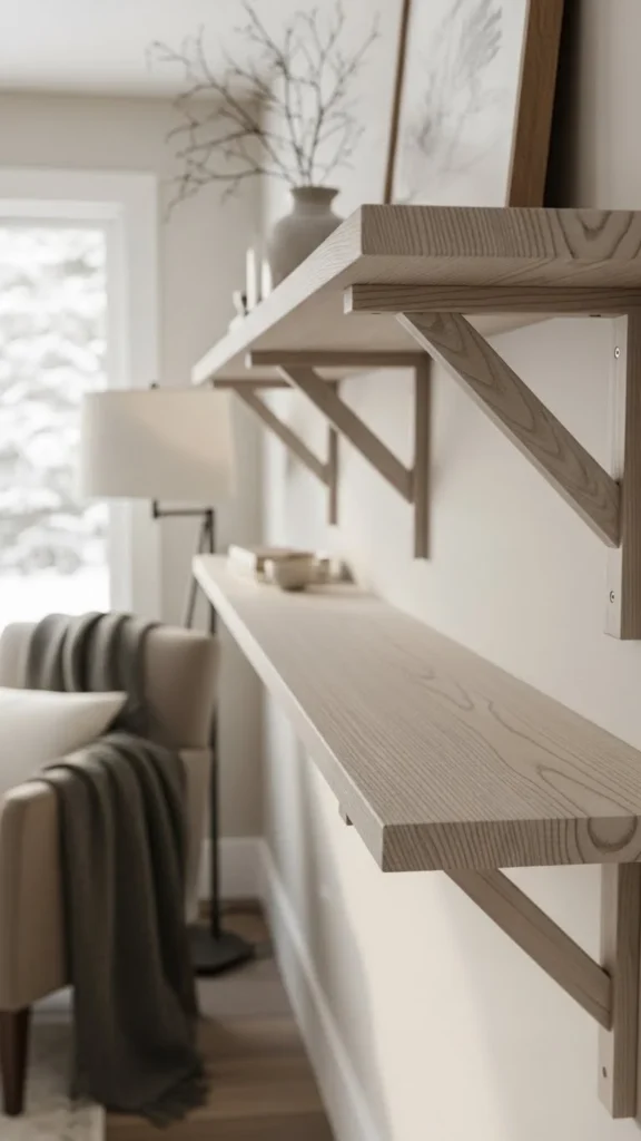 Floating shelves made from bleached white pine keep walls useful without feeling heavy. The pale finish reflects winter light and helps small rooms feel open. These shelves work well in living rooms, kitchens, and bedrooms.