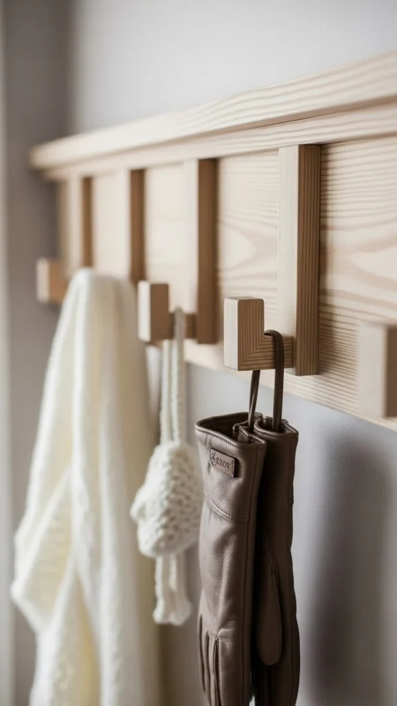 Wall hooks made from bleached pine add function without visual weight. They suit entryways and bedrooms.