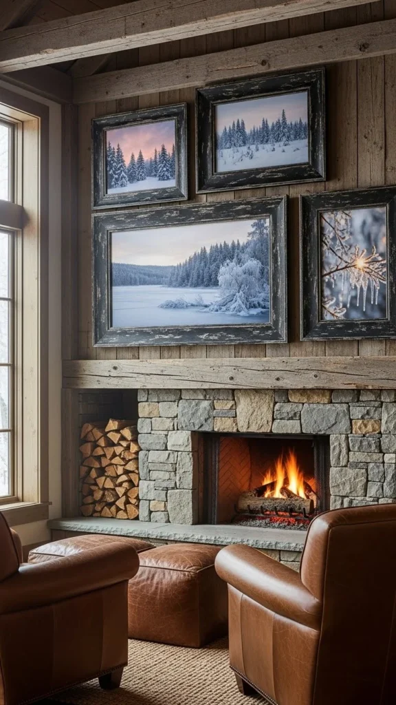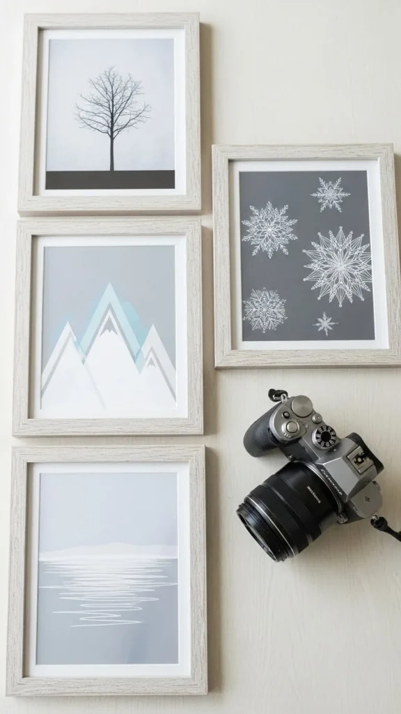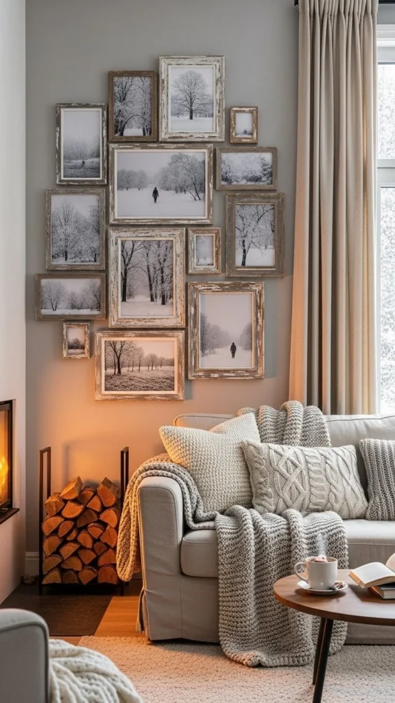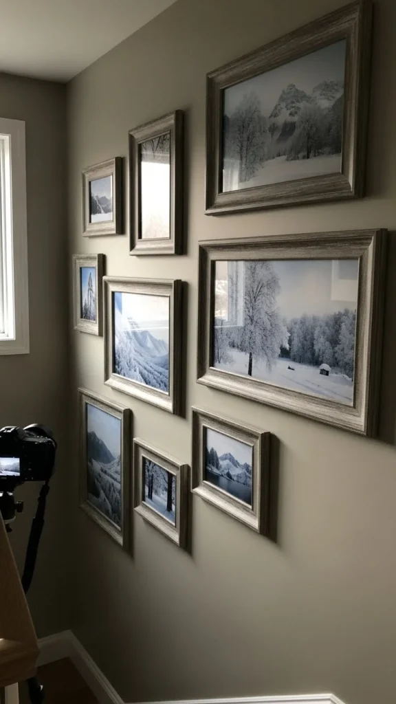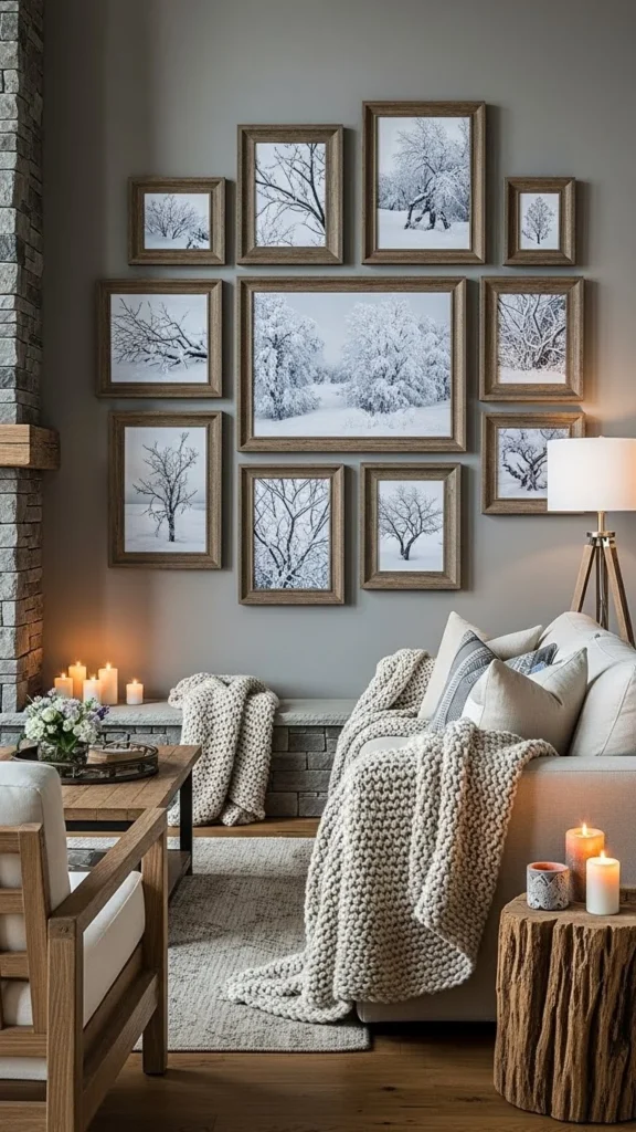 You don’t need matching art. Family photos, sketches, or pressed winter leaves work well. Lay frames on the floor first to plan spacing.