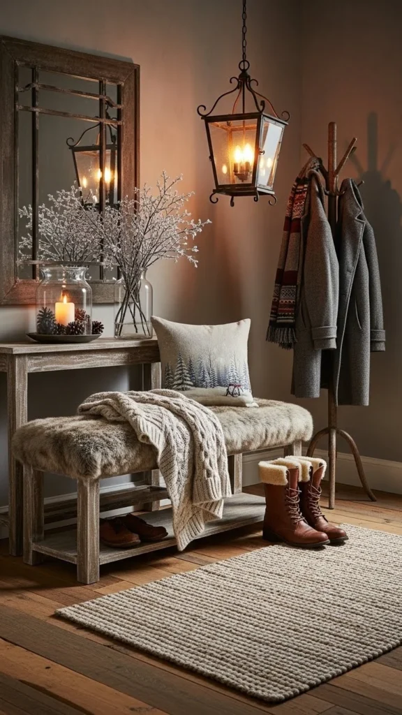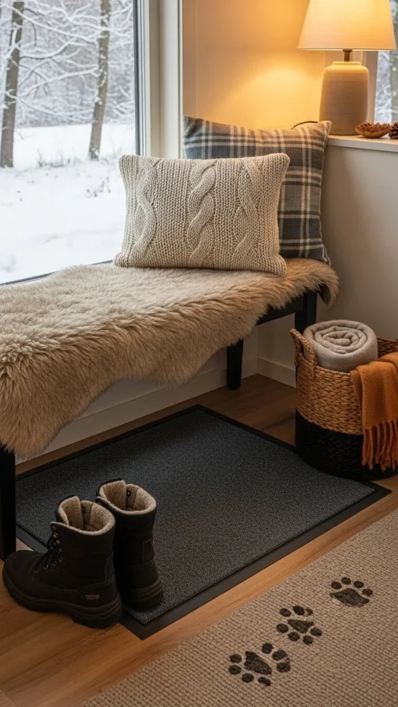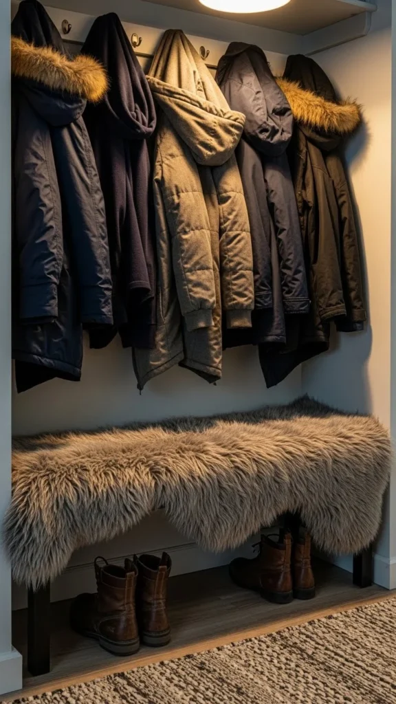 Mudrooms handle mess. Choose darker faux-fur tones. Look for benches with washable covers. DIY option includes removable mats under the bench. This setup stays functional during winter weather.