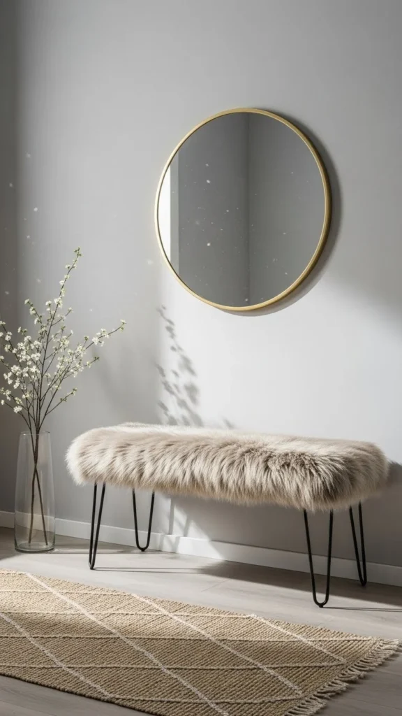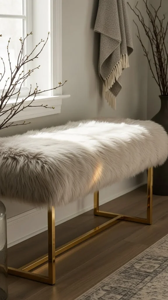 Compact benches fit studio and rental spaces. Look for benches under 36 inches wide. Faux-fur adds comfort without crowding the room. Lightweight frames are easy to move. DIY alternative uses a storage ottoman with a fur slipcover. Keep accessories minimal. A wall hook replaces bulky coat racks. This bench proves size does not limit comfort.