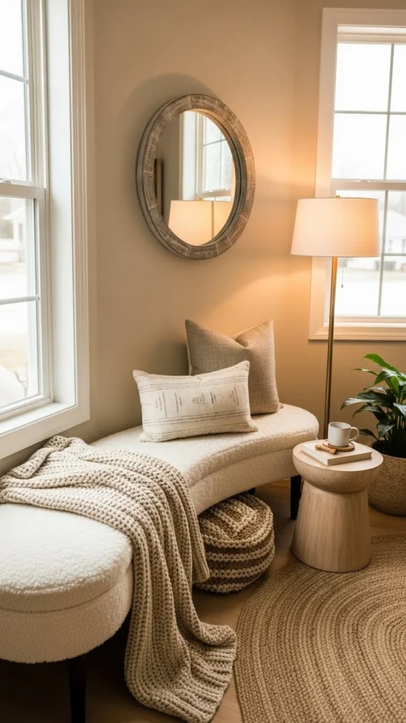 Curved benches fit awkward corners. They soften traffic flow. Many foam-based designs stay affordable. DIY option includes cutting plywood into a curve. Upholster with stretch faux-fur. This bench makes unused corners useful.