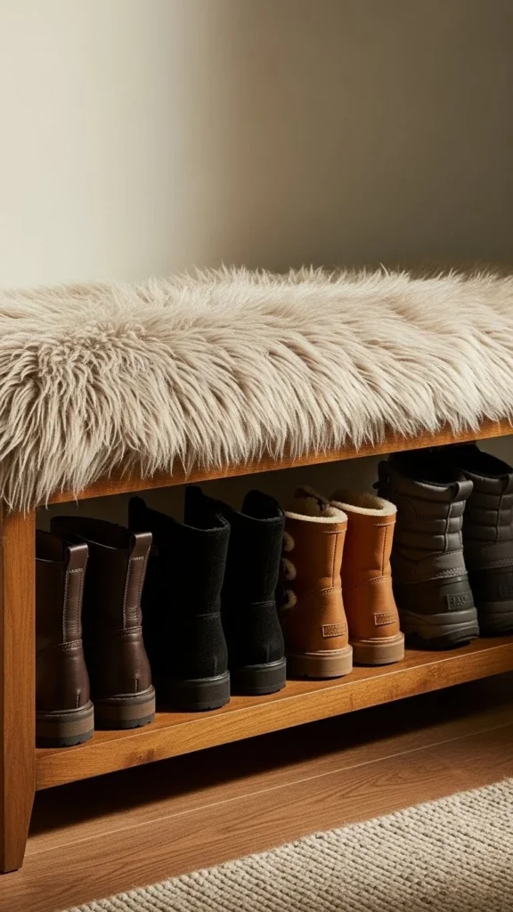 This bench keeps shoes visible and easy to grab. Faux-fur on top adds comfort while sitting. Choose benches with slatted shelves for airflow. Budget tip: use labeled bins to keep pairs organized. DIY option includes stacking wooden crates and topping with a padded fur cushion. This works well for families. Keep fur darker if mud is common. Regular shaking keeps debris away.
