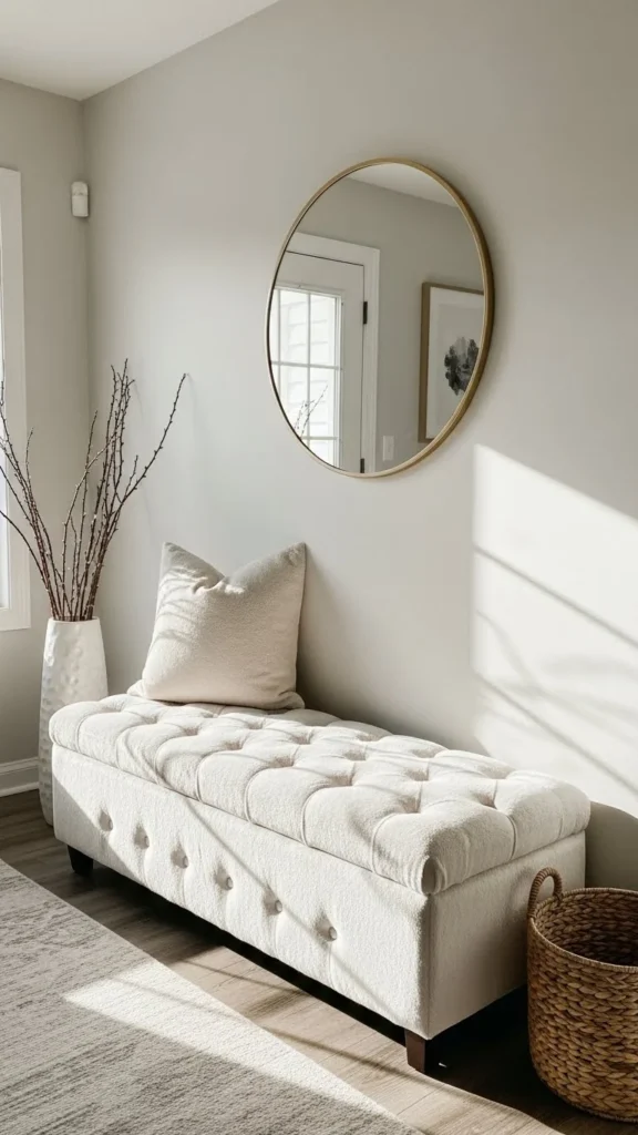 Hallway benches stay slim but useful. Look for depth under 14 inches. Faux-fur adds softness where space feels tight. DIY option includes wall-mounted brackets with a padded top. Keep storage vertical to save floor space.