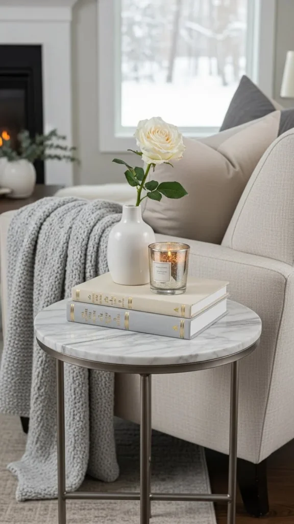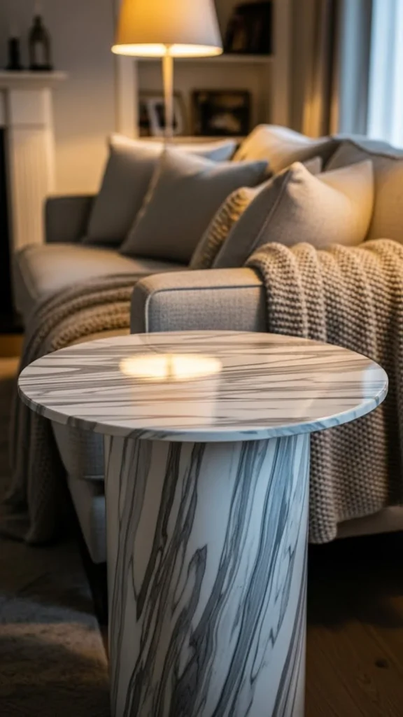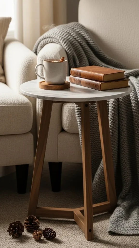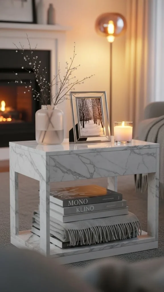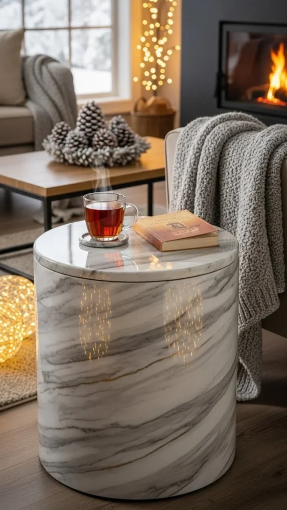 Faux-marble side tables suit winter interiors by adding smooth surfaces, light reflection, and calm structure. With many affordable materials and easy DIY options, this look fits everyday homes without heavy spending. Starting with one well-placed table can support cozy winter living while keeping rooms tidy and visually balanced.