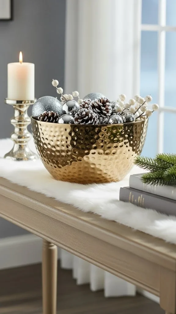 Texture adds interest without extra objects. Hammered or brushed finishes reduce glare. Use the bowl to hold keys or gloves. This keeps entry spaces organized while adding warmth.