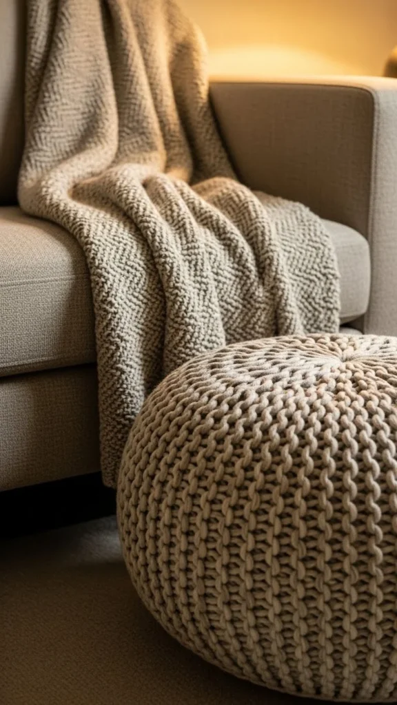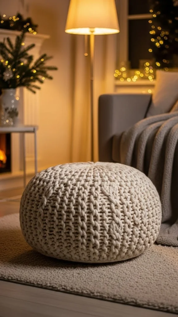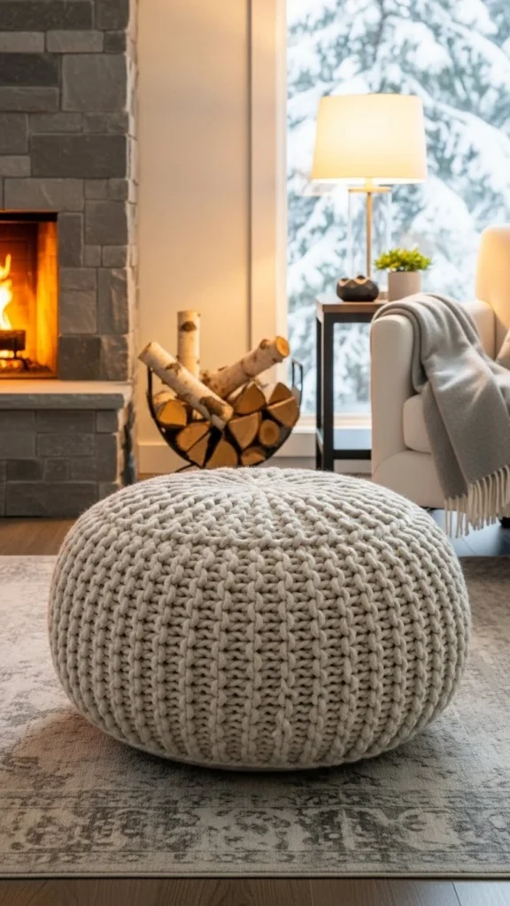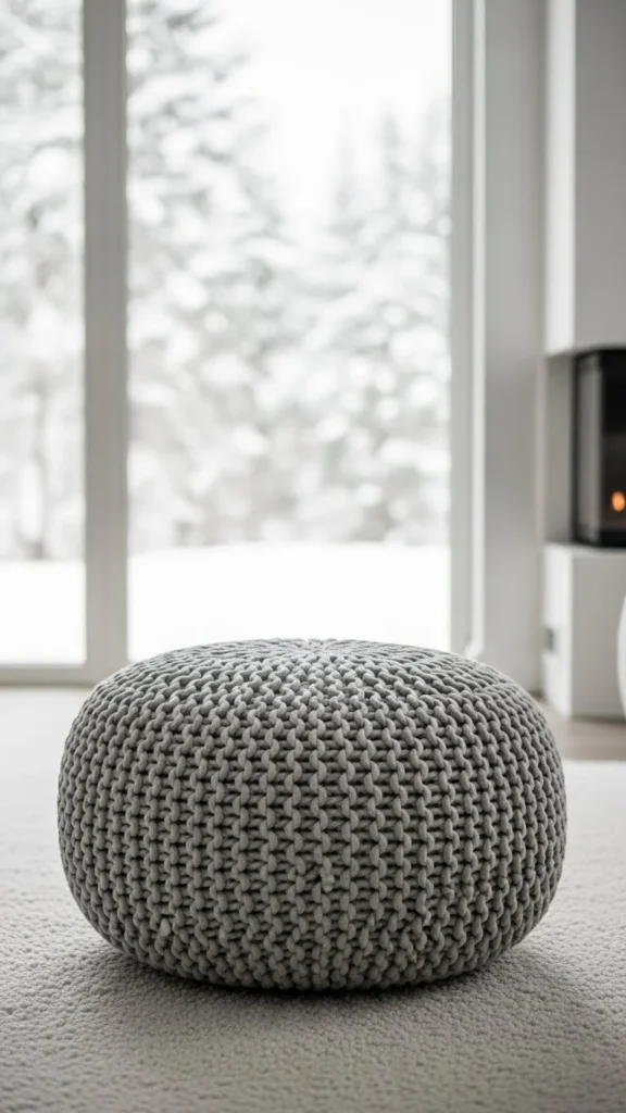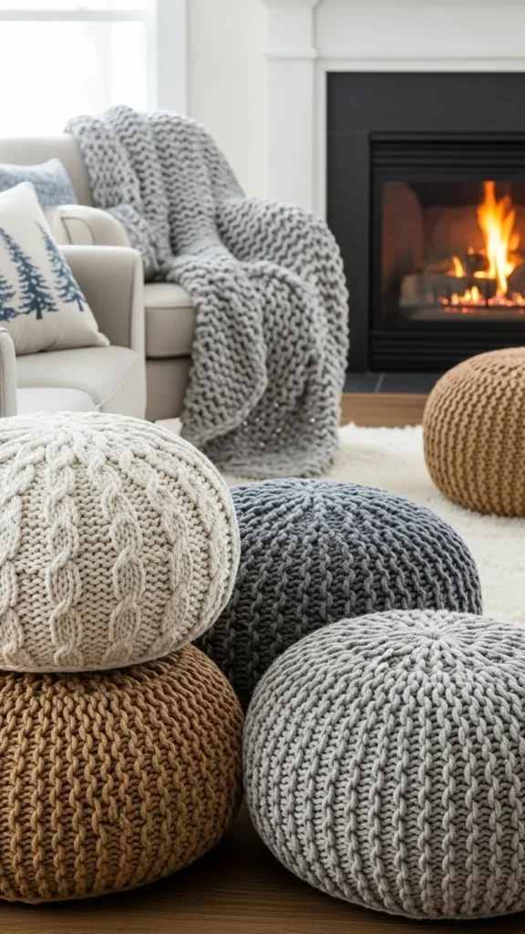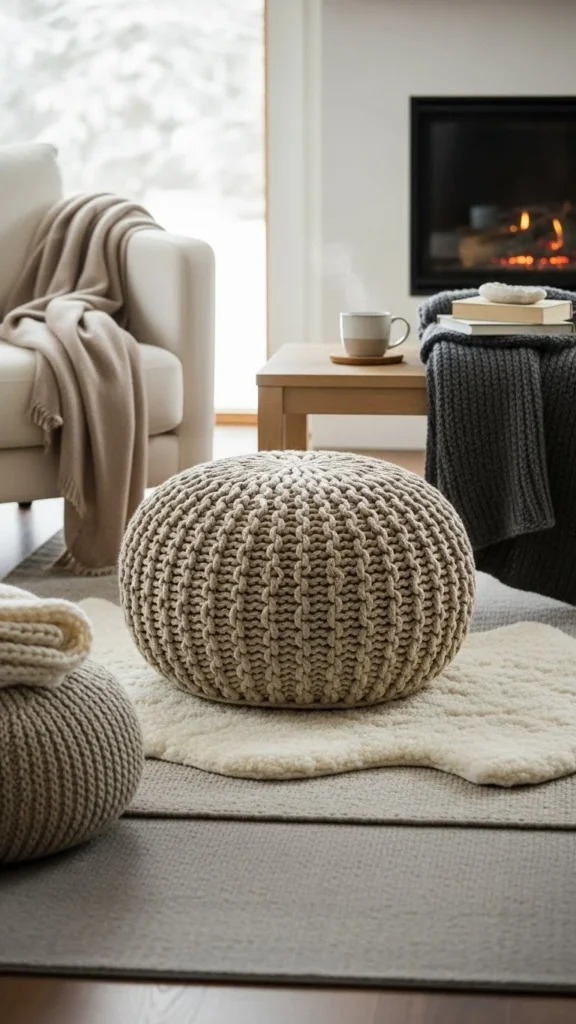 Beige knit poufs bring warmth without drawing attention. They suit calm winter interiors.