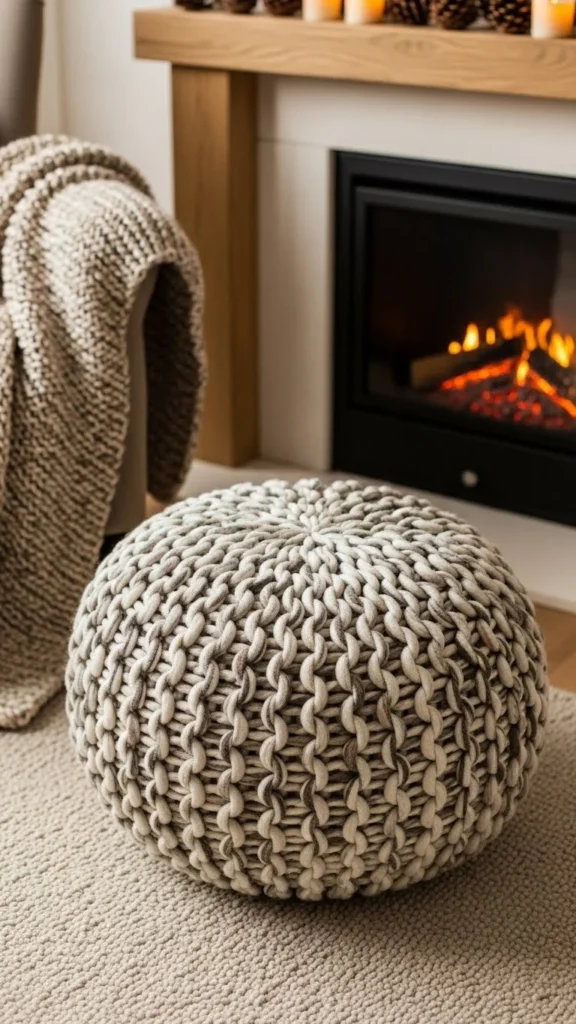 Round chunky-knit poufs are winter staples. Their shape feels friendly and relaxed, making them easy to place near sofas or armchairs. The thick knit adds texture that pairs well with wool throws and soft rugs.
