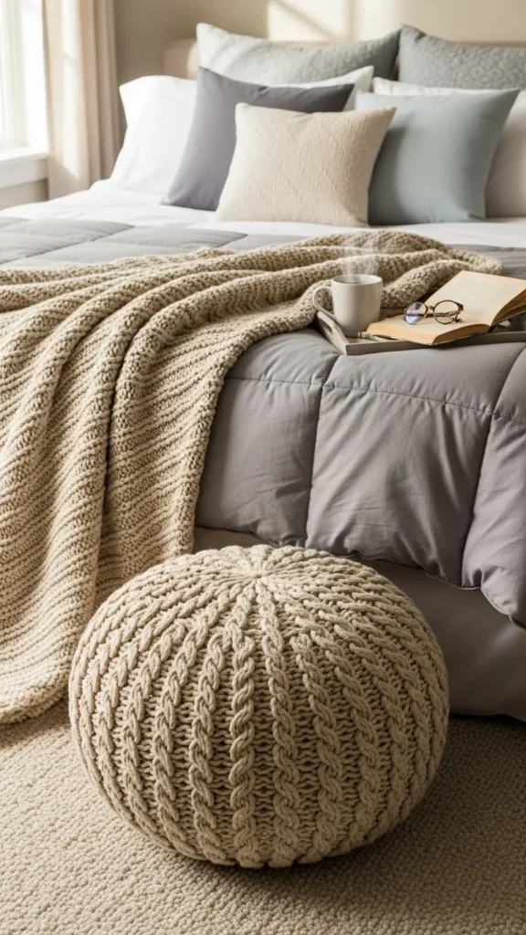 Bedroom poufs offer seating and comfort. Knit textures feel calm.