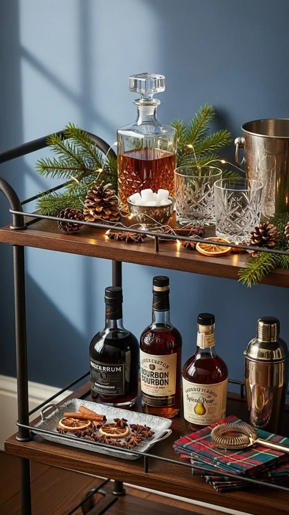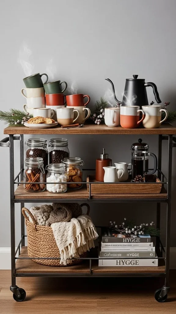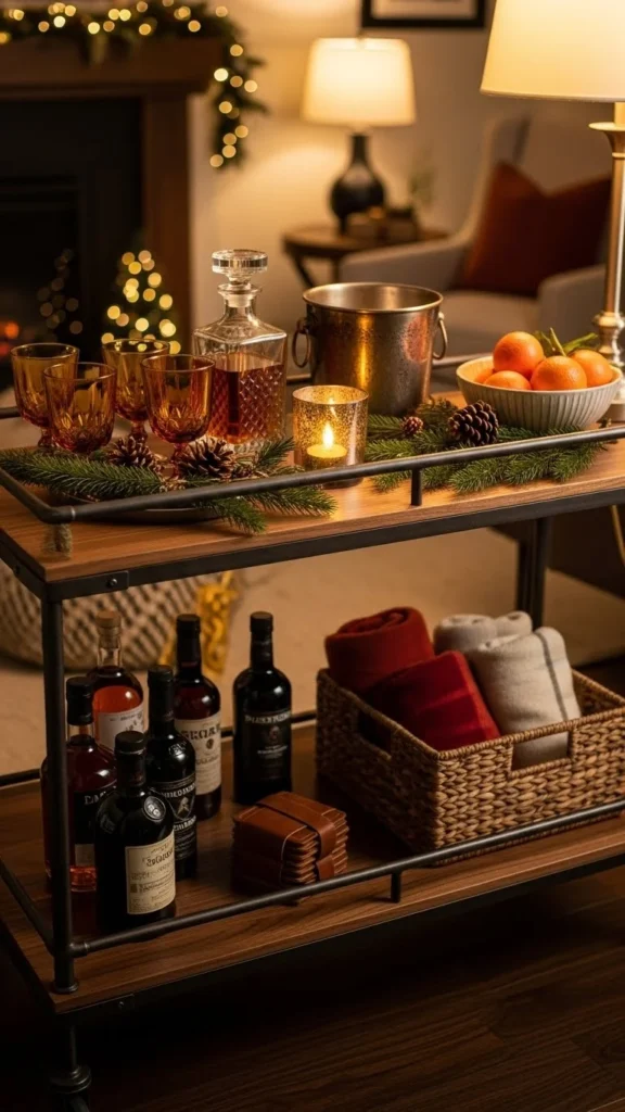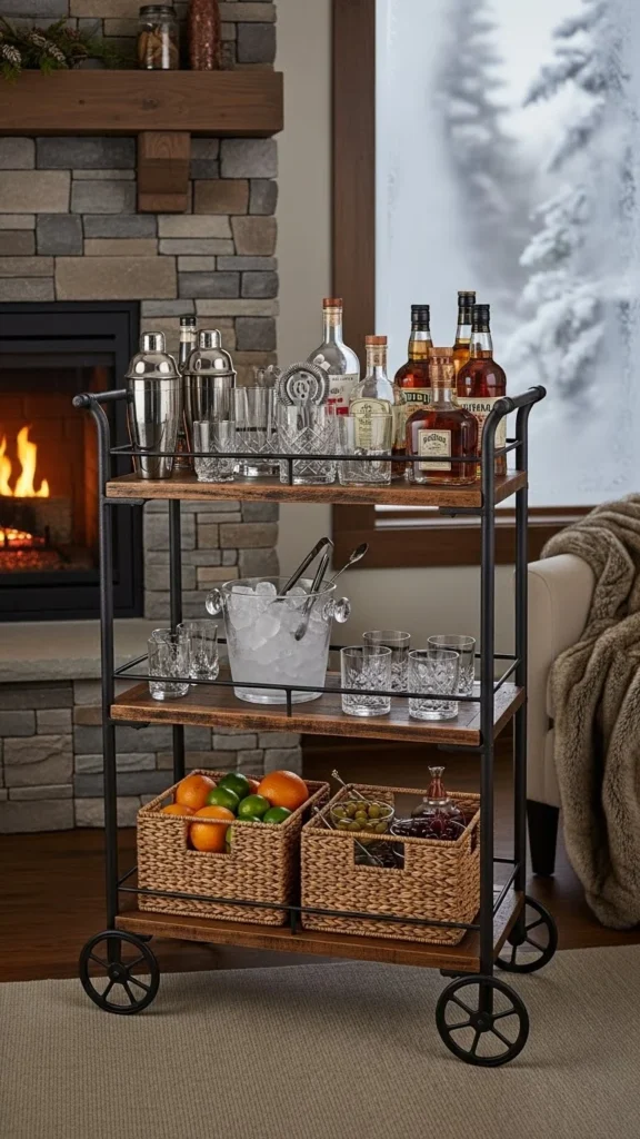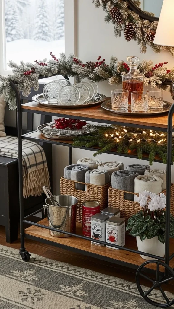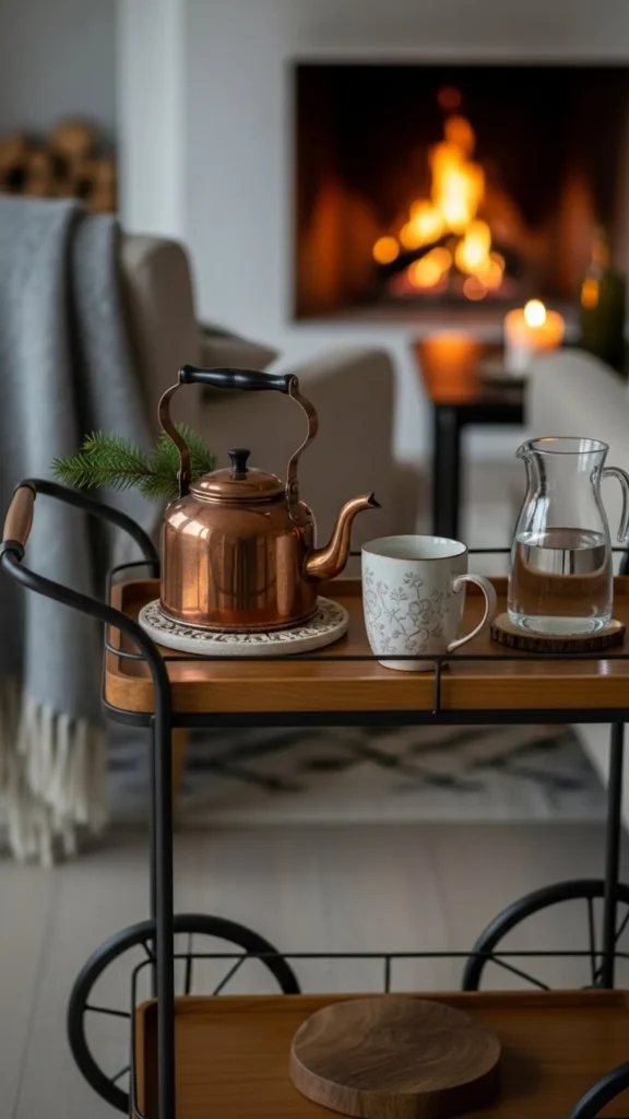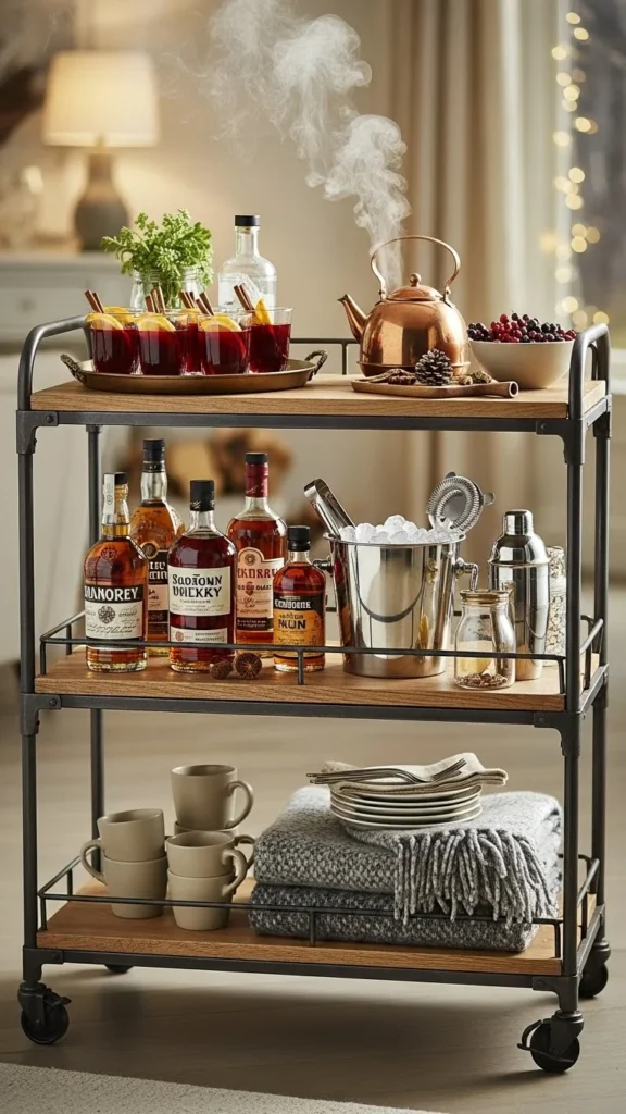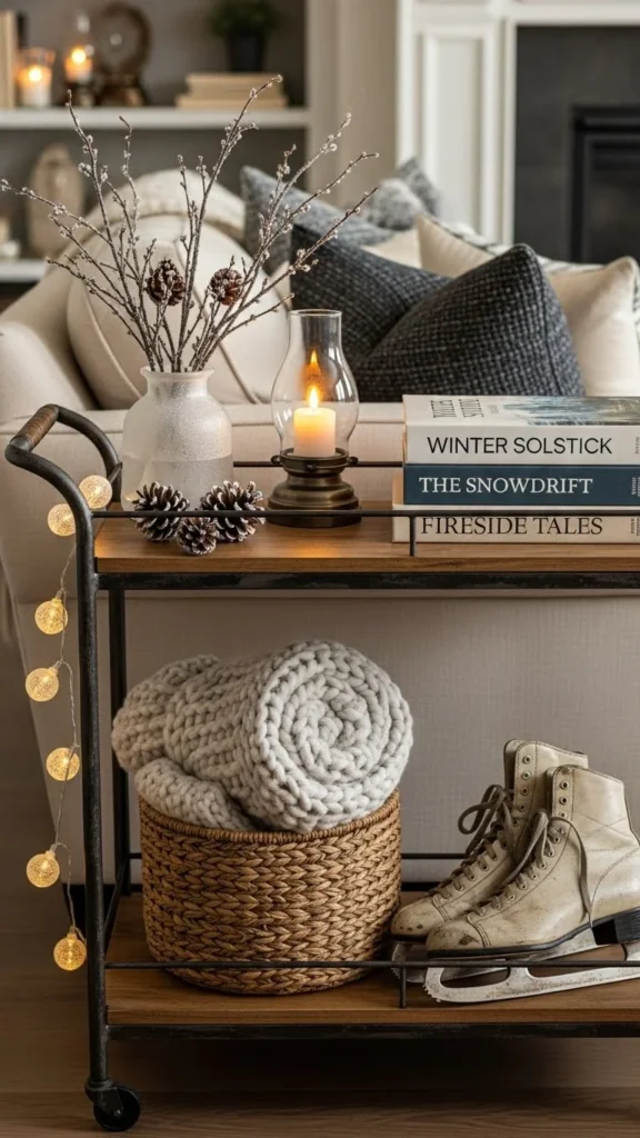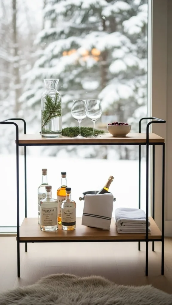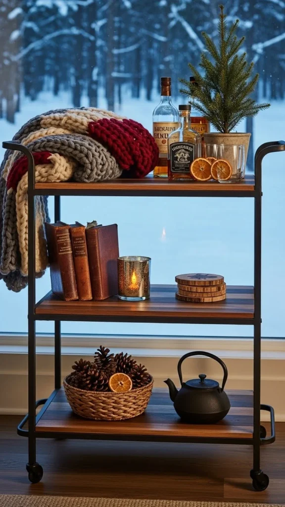 Neutral styling keeps the cart flexible. Use clear glass and simple ceramics. This works beyond winter.