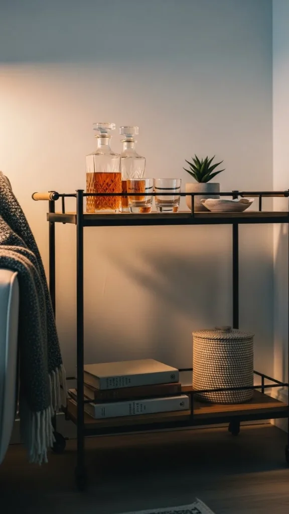 Bar carts work as side tables. Keep only essentials on top. This adds storage without extra furniture.