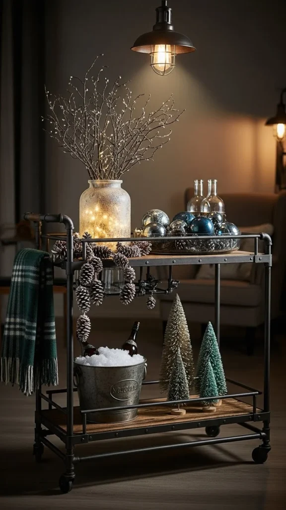 Reclaimed wood adds character. Pair it with raw iron for contrast. Thrifted carts or old utility frames work well for DIY builds. Sand wood lightly and seal it for indoor use. This style suits relaxed winter interiors.