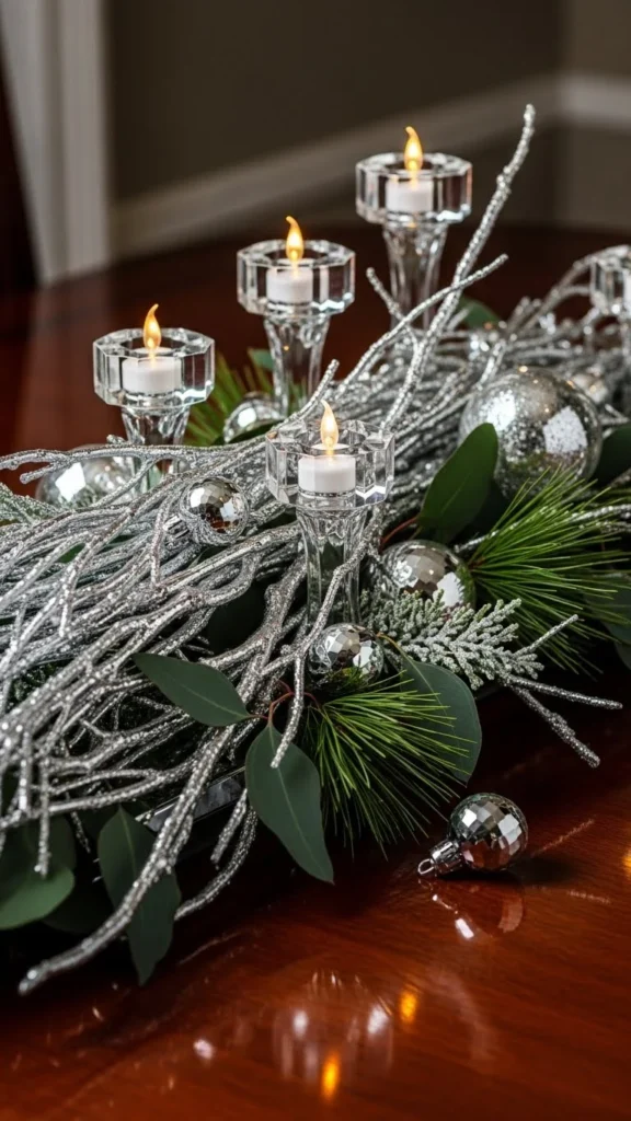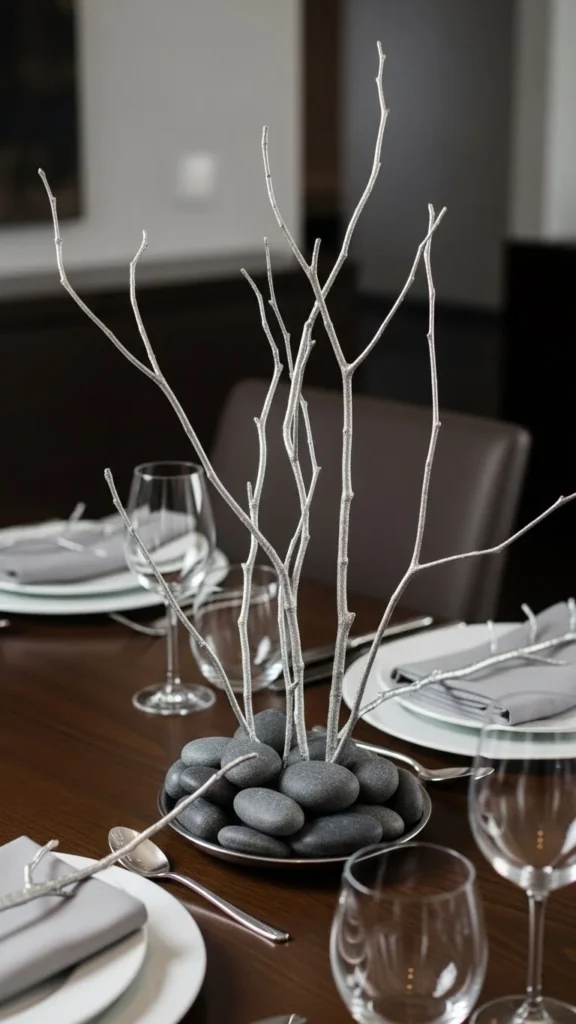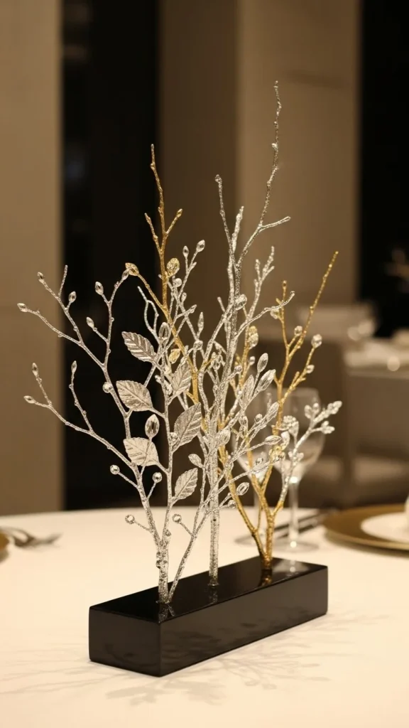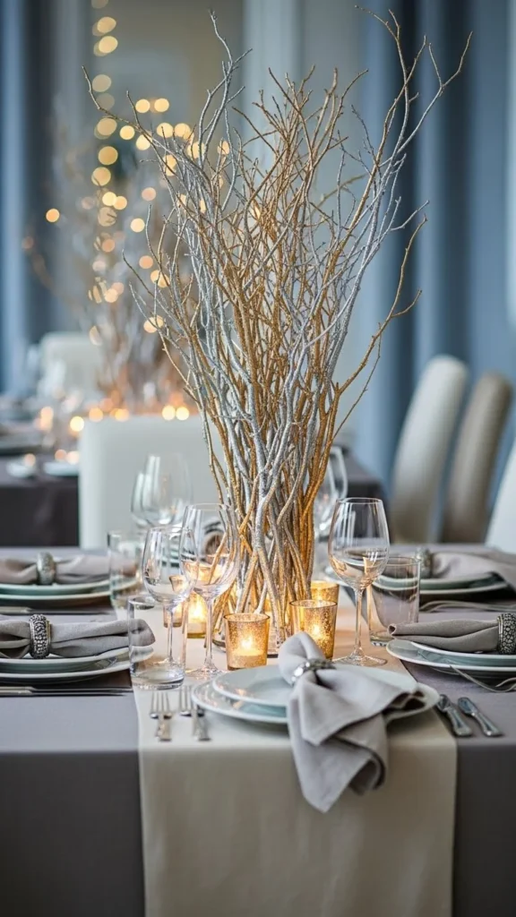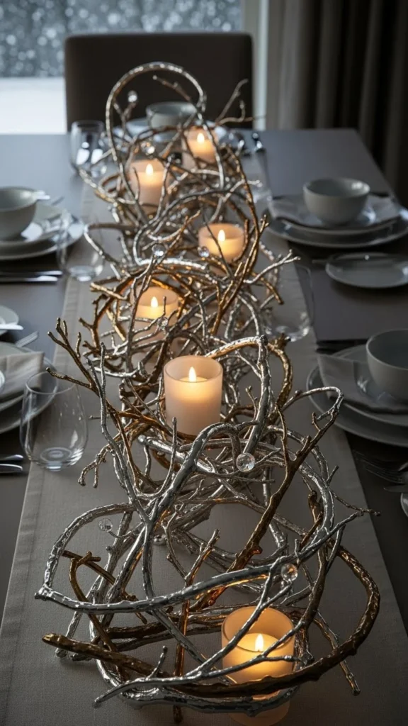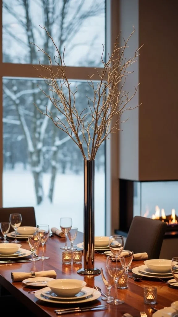 A striking winter dining table centerpiece featuring tall metallic-painted twigs arranged in a wide low-profile vase, soft candlelight glowing around the base, neutral linen runner, subtle silver and champagne reflections on the twigs, cozy evening ambiance, shallow depth of field, high-end DSLR photography,