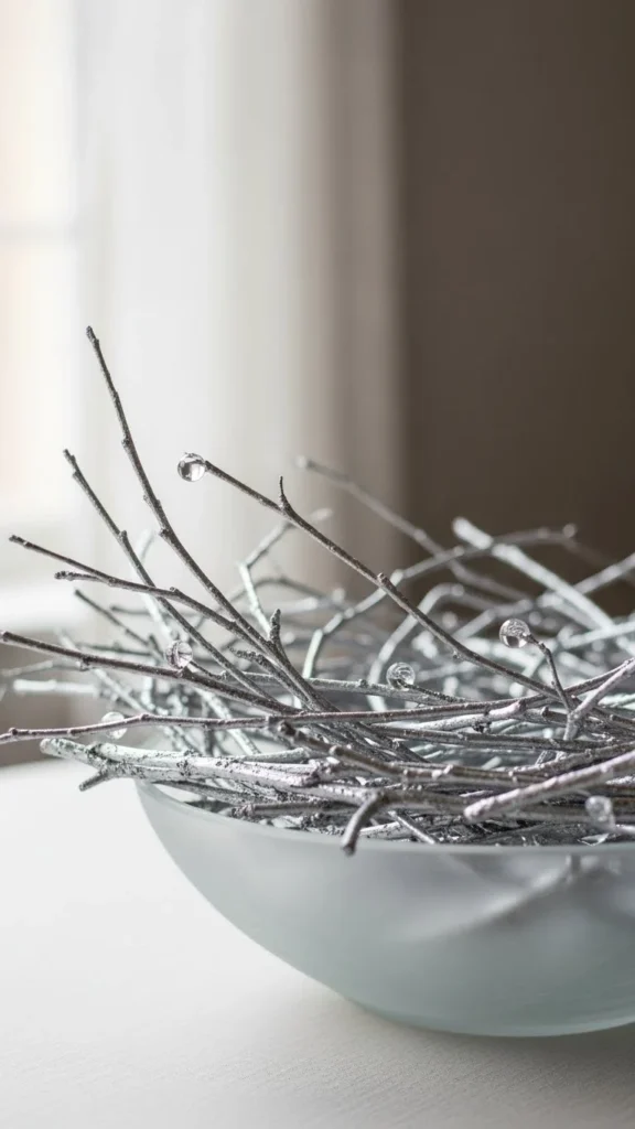 Silver-dipped twigs offer a clean winter look that feels intentional without being complicated. Start by collecting birch or thin branches. Clean them and let them dry. Dip only the tips into silver craft paint. Let excess drip off naturally.