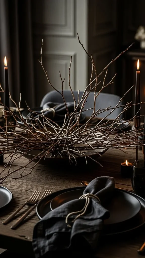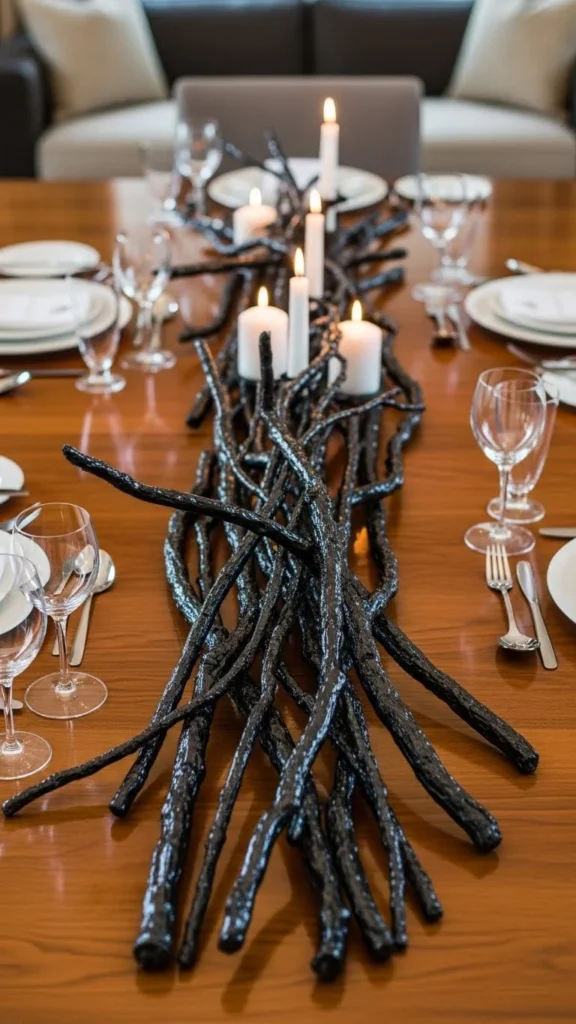 A twig runner works well on long tables. Paint twigs black with a soft metallic sheen. Keep the finish subtle.