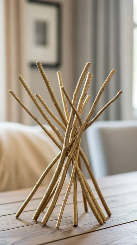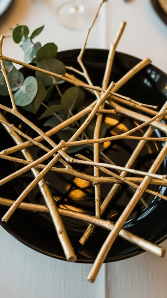 Matte gold twigs add warmth while staying understated. Use fallen branches cut into shorter lengths. Paint them fully with matte gold spray or brush-on paint.