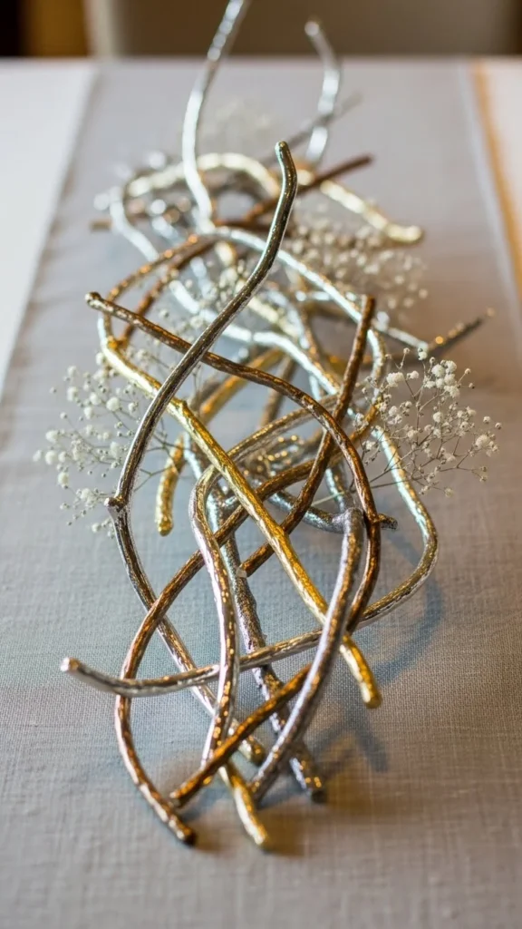 22. Metallic twig centerpiece arranged on a long dining table