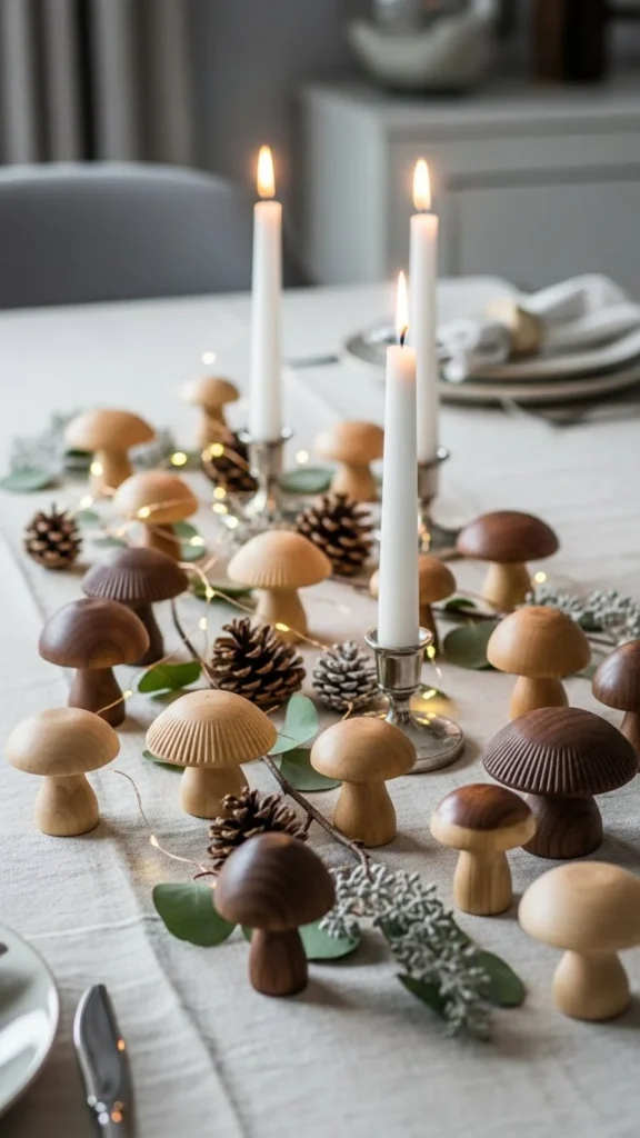 Small wooden mushrooms scattered lightly across a table add detail without effort. Use sparingly.