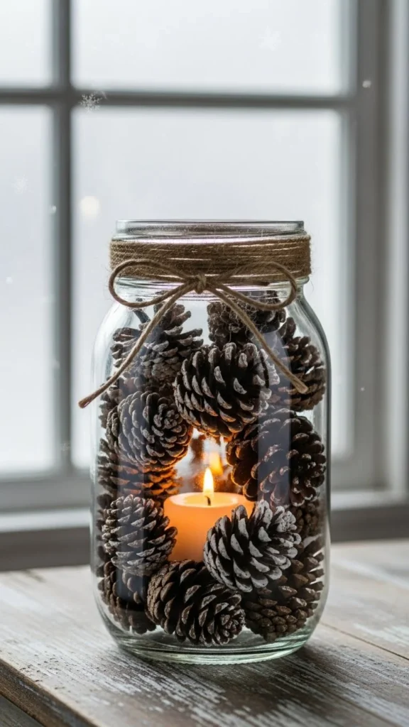 1.Snow-Dusted Mason Jar Pine-Cone Lanterns