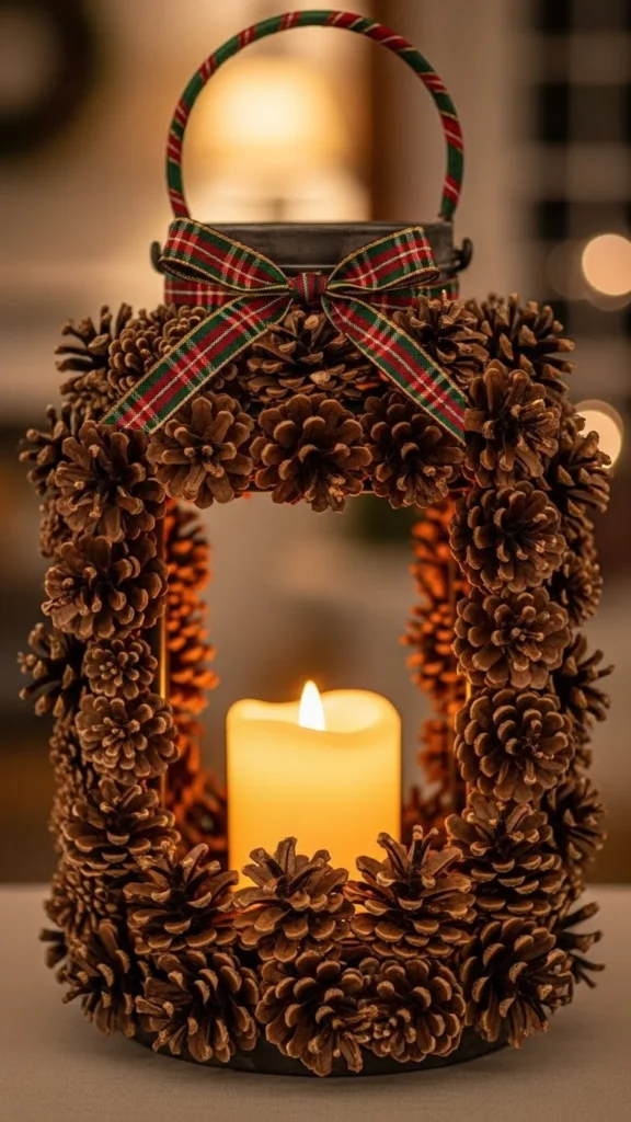 13.Pine-Cone Lanterns with Plaid Ribbon Touches