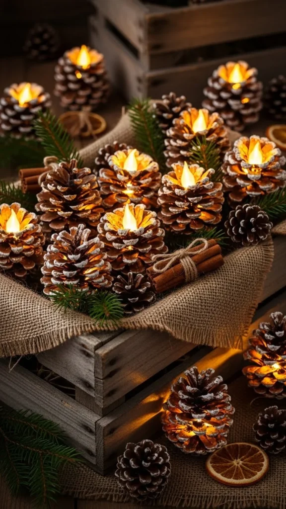 15.Pine-Cone Lanterns in Wooden Crates