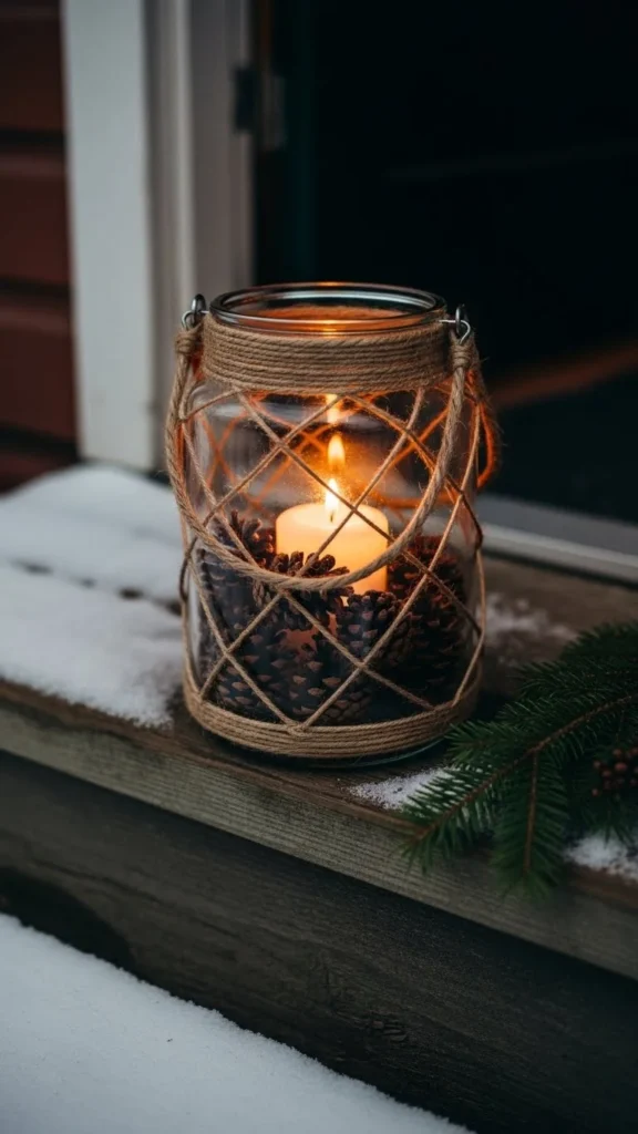 Twine adds texture without spending much. Wrap twine around a simple glass lantern or jar. Secure with hot glue at the back. Inside, place pine cones of different sizes. Add a tea light in the center.