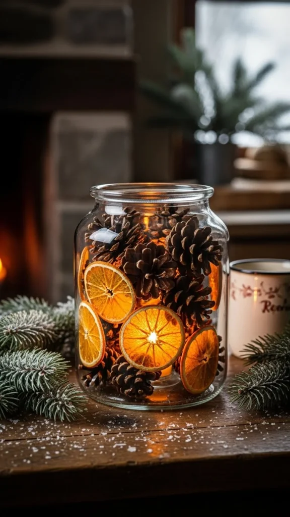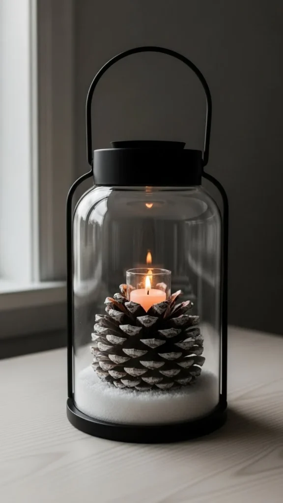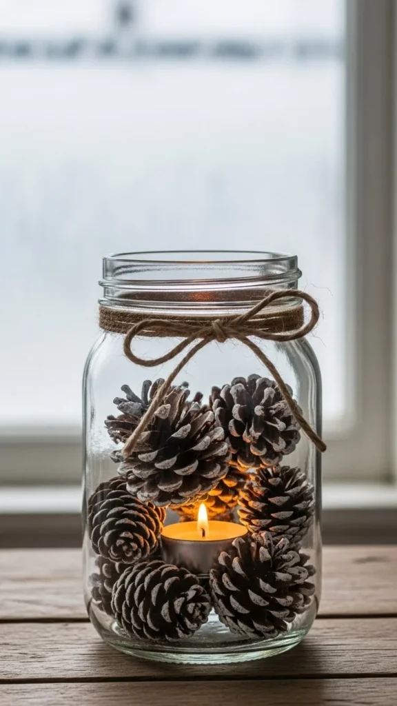 These lanterns start with jars you already have. Clean them well. Add a thin layer of faux snow using glue and a brush. Drop in small pine cones you gathered outside. Place a battery tea light in the center. The glow filters through the cones and glass in a gentle way.