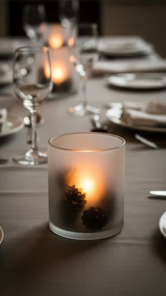 Frosted glass softens light fast. Use spray frosting or white glue mixed with water. Coat the outside of a jar lightly. Let it dry fully. Place pine cones inside and add a candle.