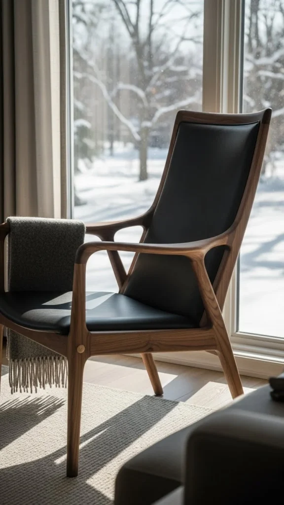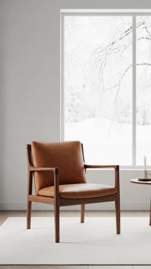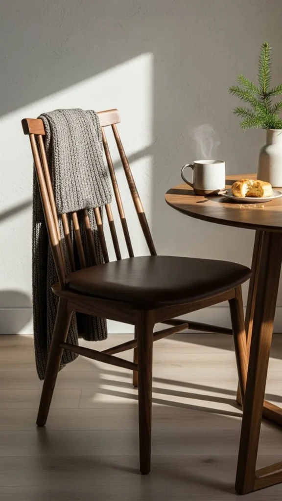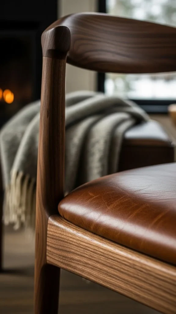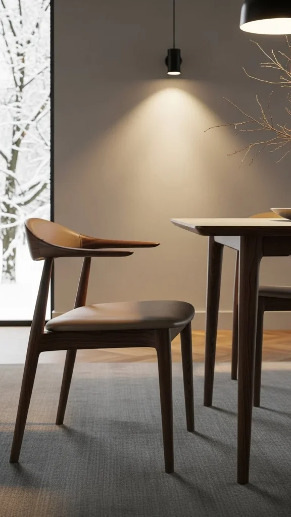 Slim-profile chairs work well when winter layouts feel tight. Heavy coats, throws, and rugs already add visual weight. A narrow walnut frame keeps the room open. Leather seats provide comfort without bulk.