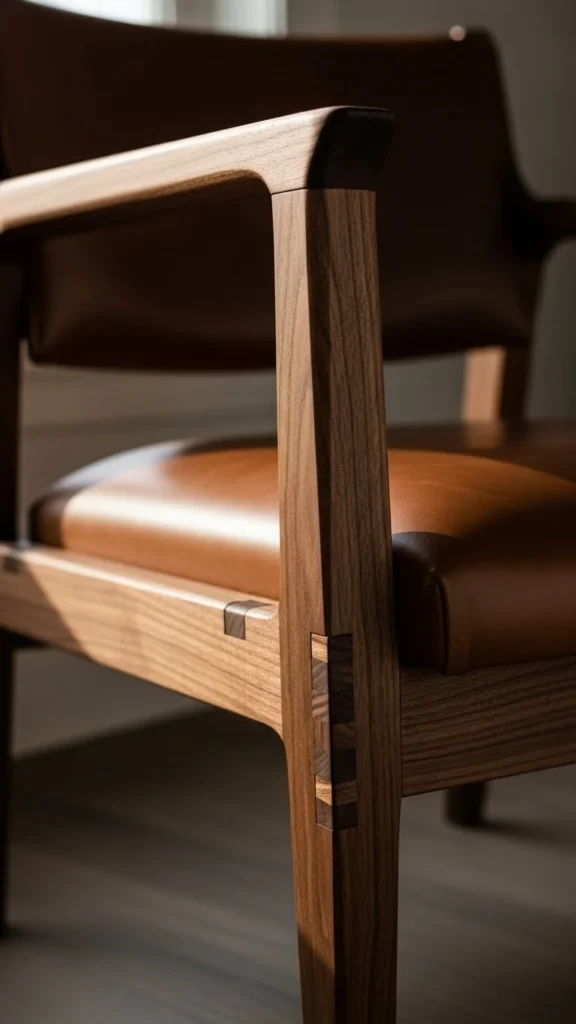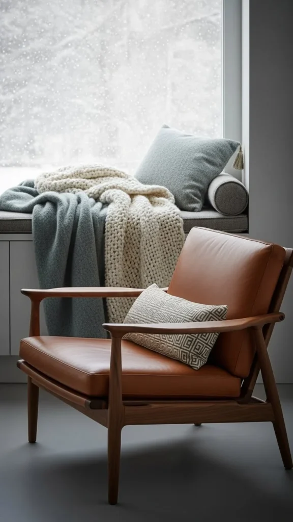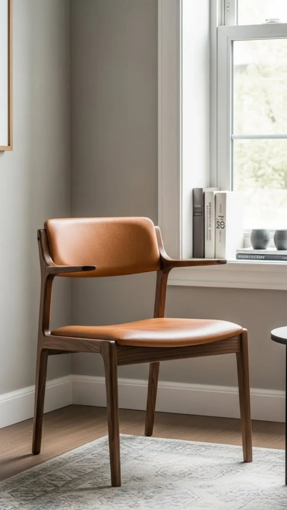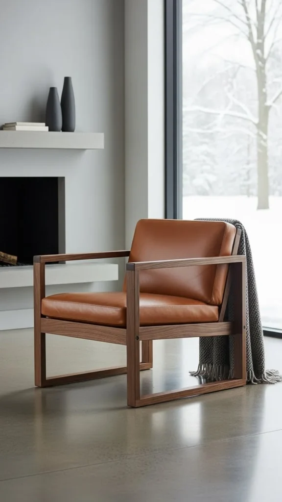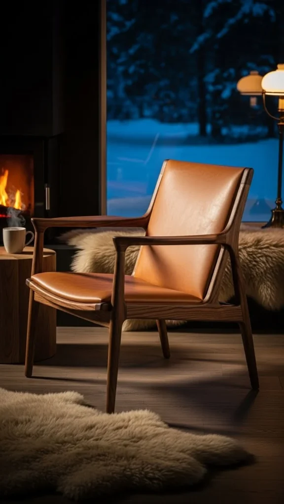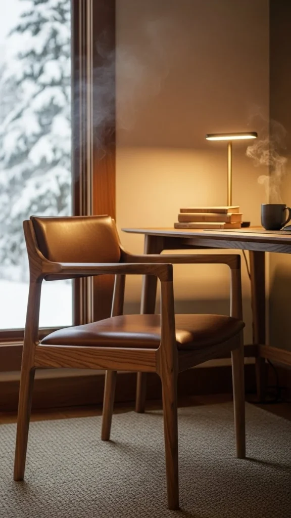 Slim-profile chairs work well when winter layouts feel tight. Heavy coats, throws, and rugs already add visual weight. A narrow walnut frame keeps the room open. Leather seats provide comfort without bulk.