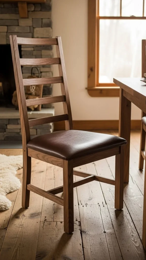Ladder-back chairs bring a classic look that feels right in winter. Walnut gives them depth. Leather pads improve comfort without altering the structure.