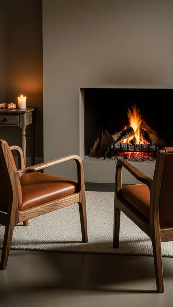 Leather wrap seats add comfort without thick cushions. Walnut arms create a solid frame that feels reliable in colder months. These chairs suit reading corners and fireside layouts.
