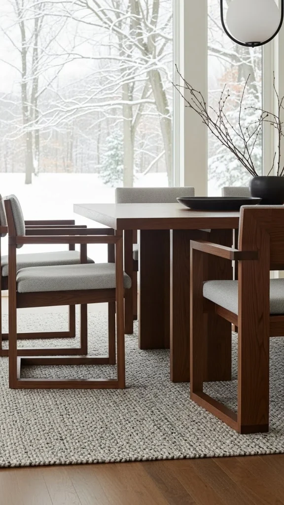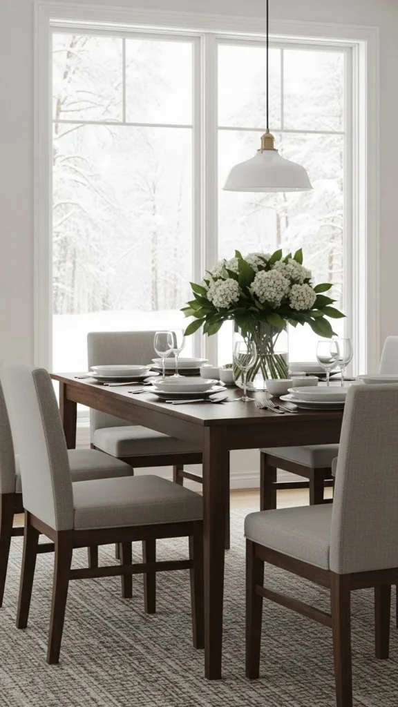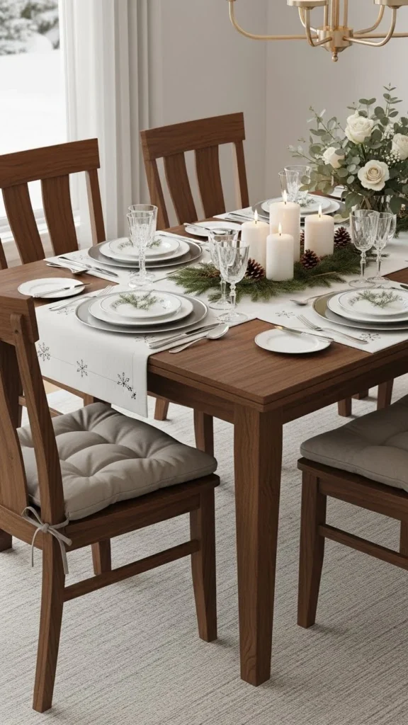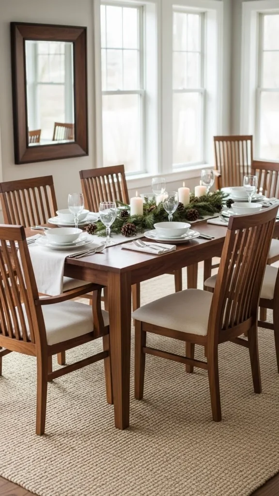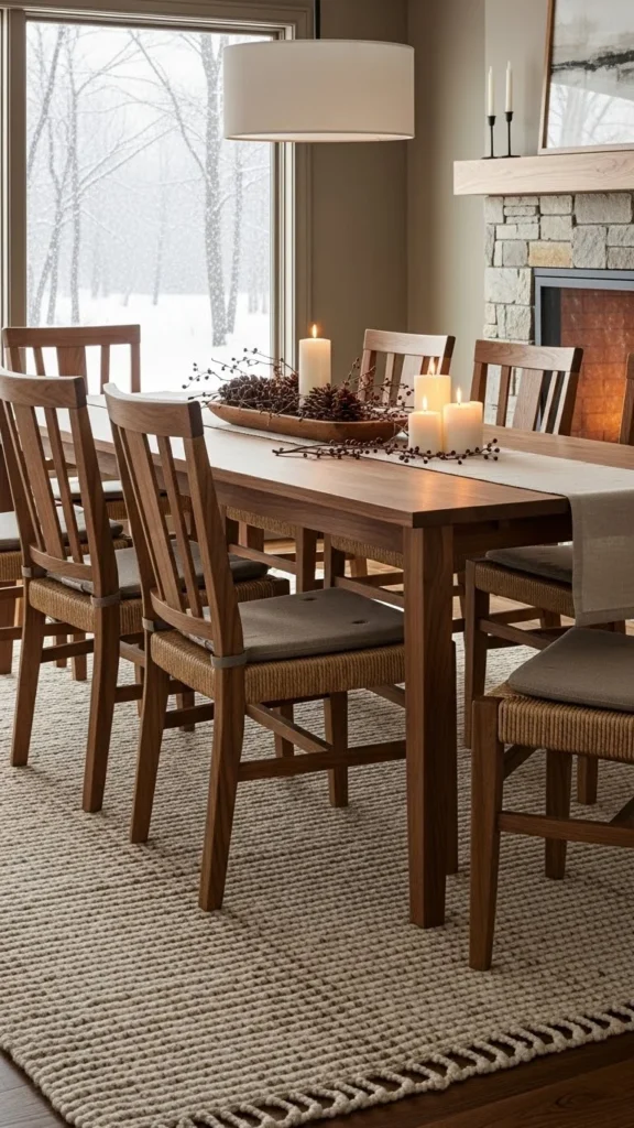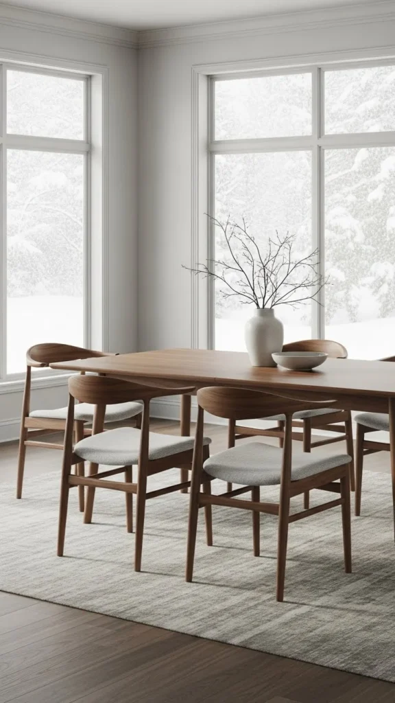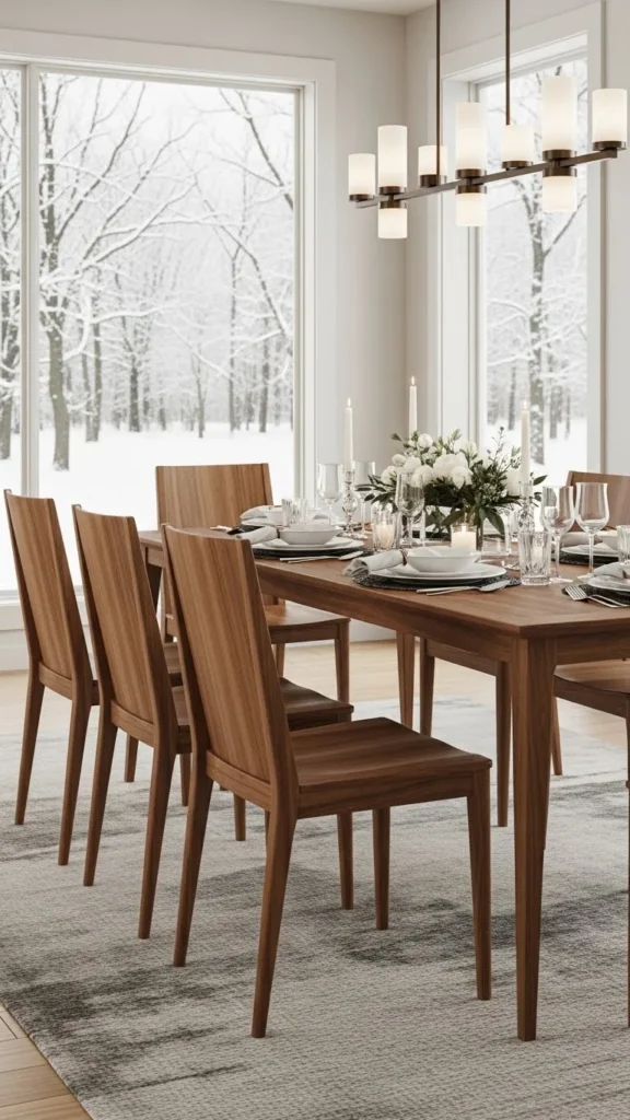 Winter styling benefits from warmth. Add cushions, runners, and soft lighting. Walnut chairs anchor the setup and support long meals.