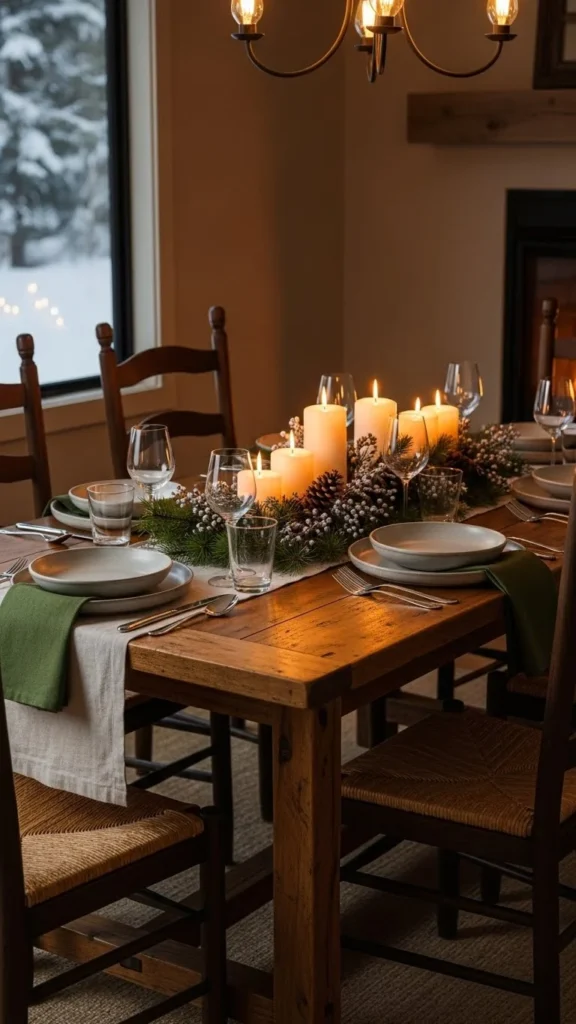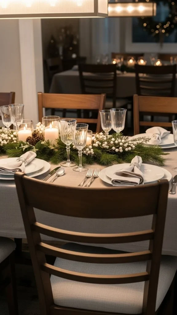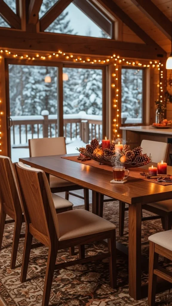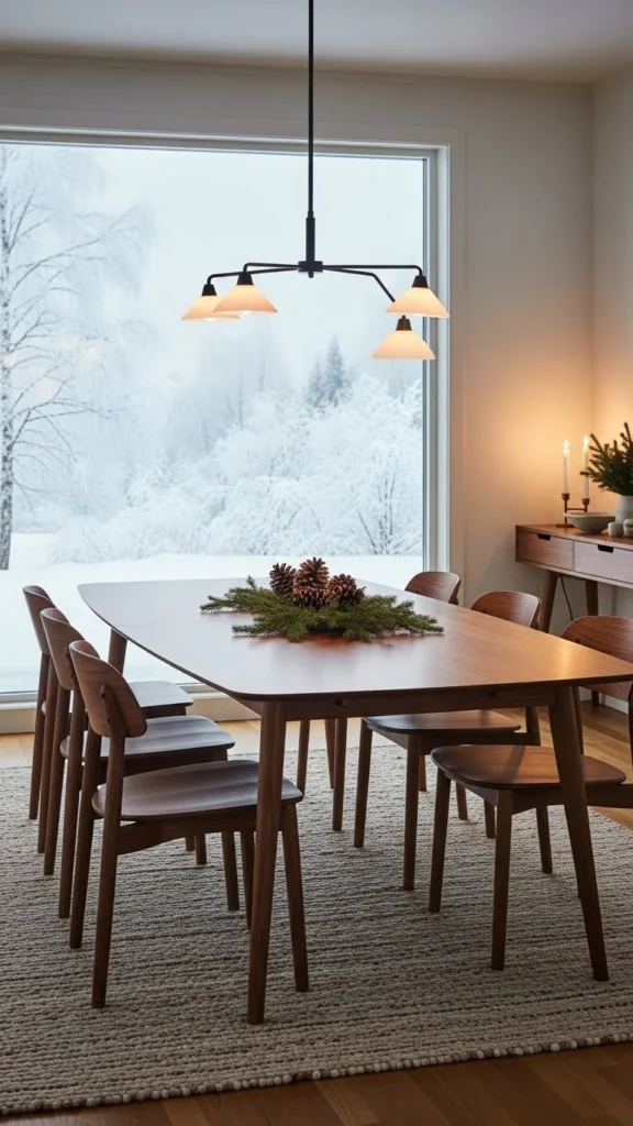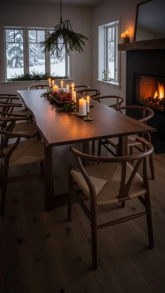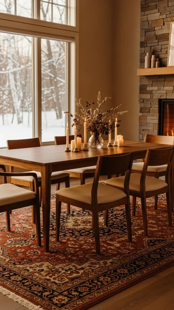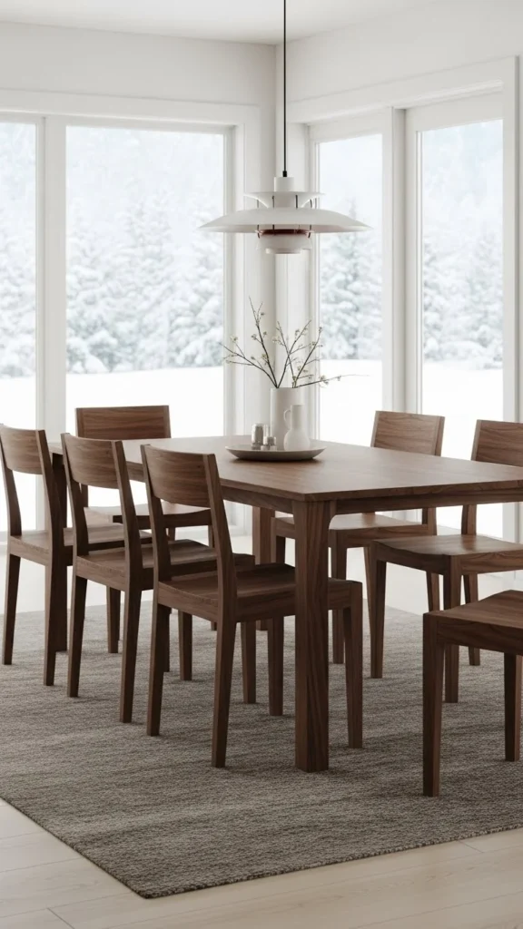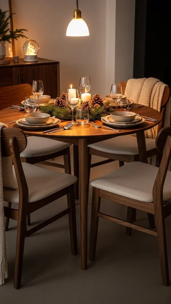Winter styling benefits from warmth. Add cushions, runners, and soft lighting. Walnut chairs anchor the setup and support long meals.