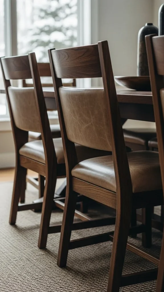 Leather seats add warmth. Faux leather works well for budgets. Clean with a damp cloth only. These chairs suit modern and classic rooms alike.