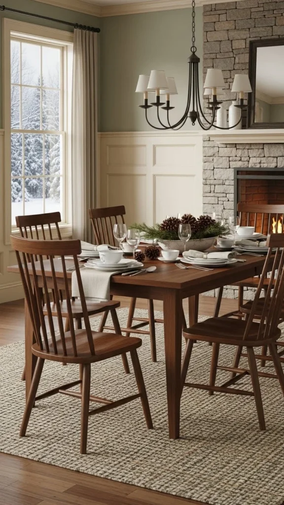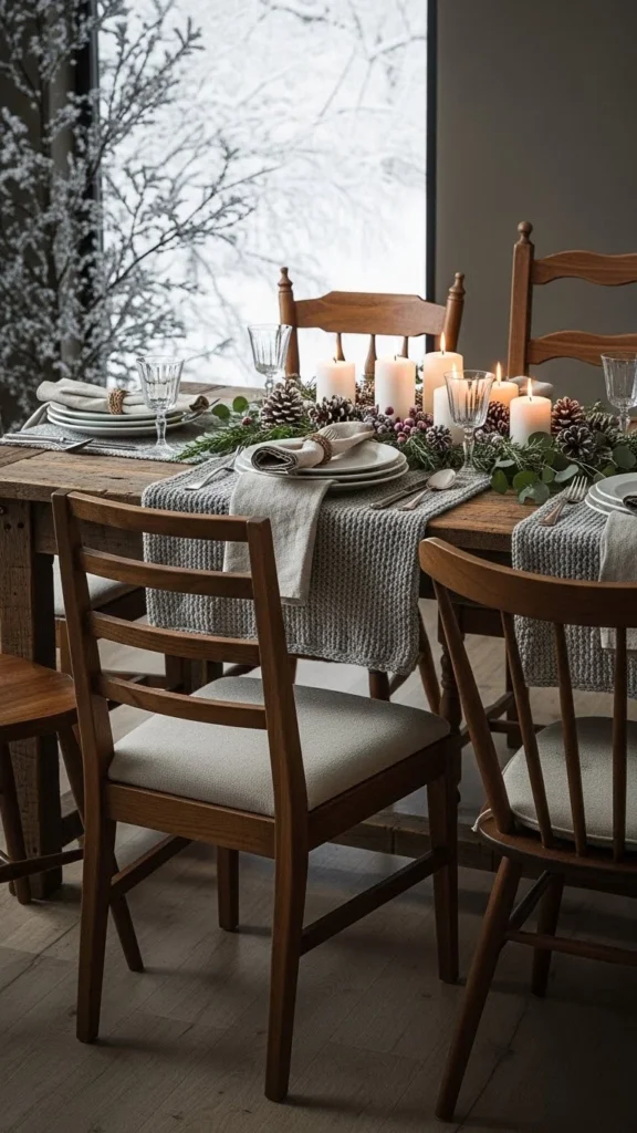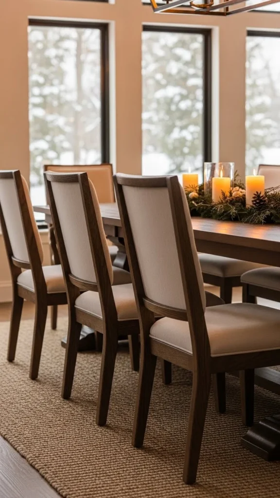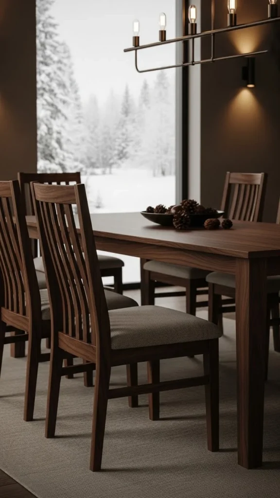 Darker stains deepen the winter mood. These chairs anchor light tables well. DIY darkening can be done with gel stain. Apply thin coats and wipe excess. Keep nearby decor lighter for balance.