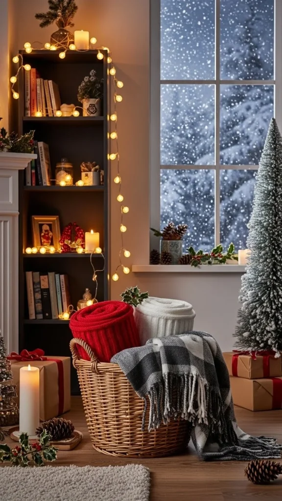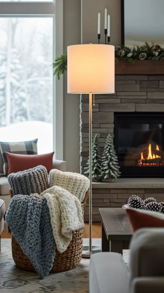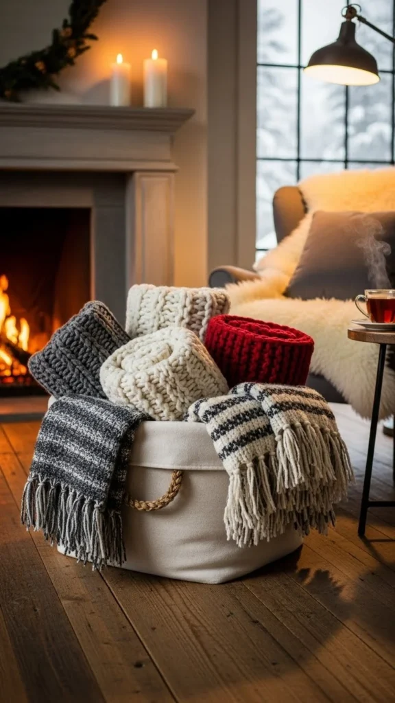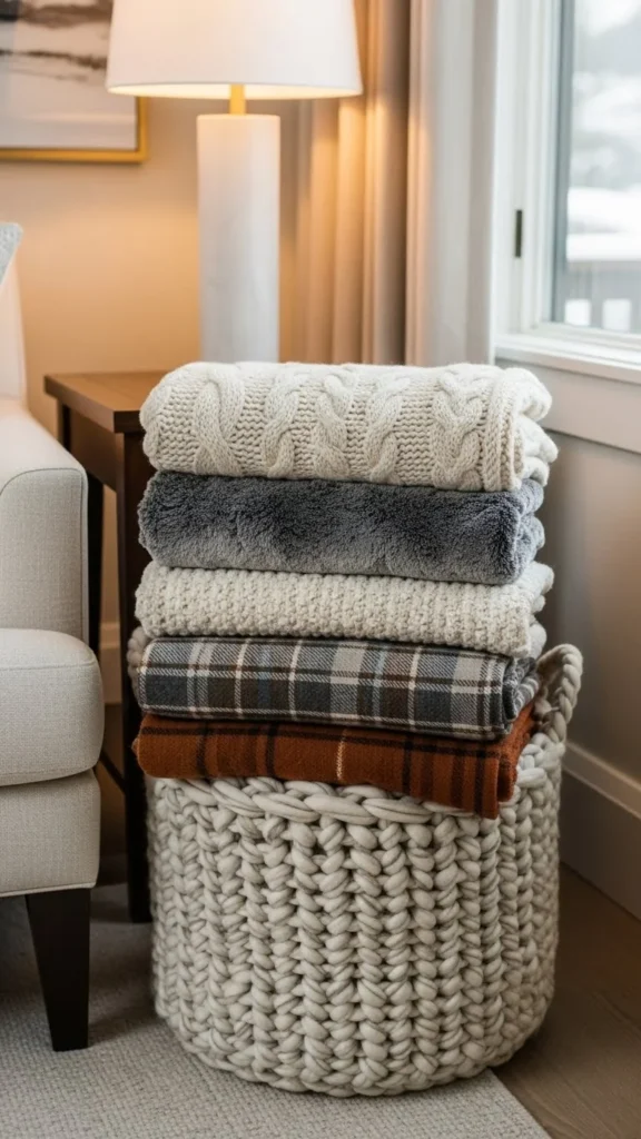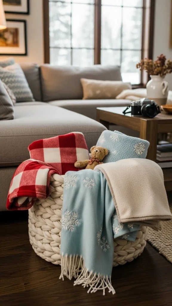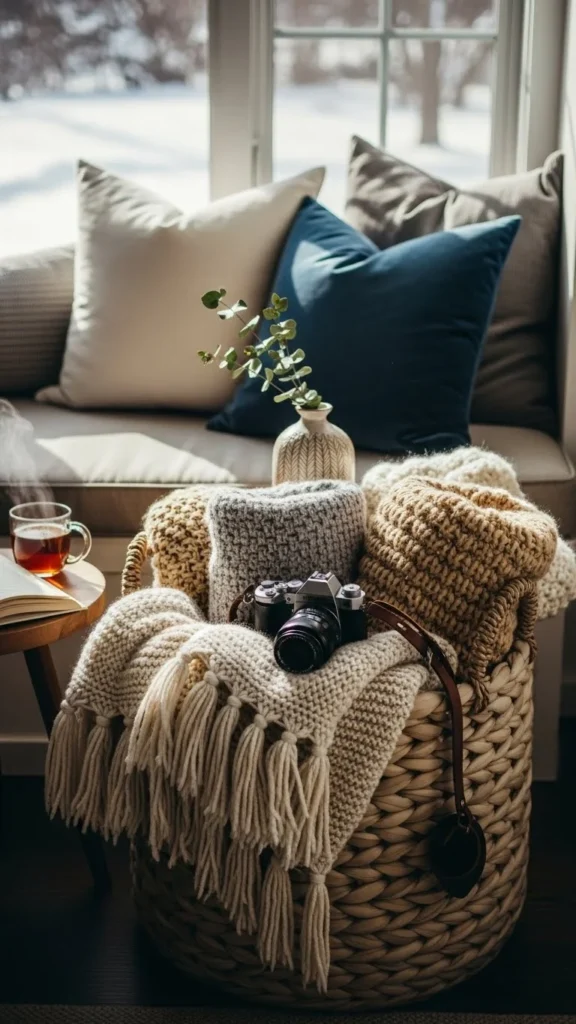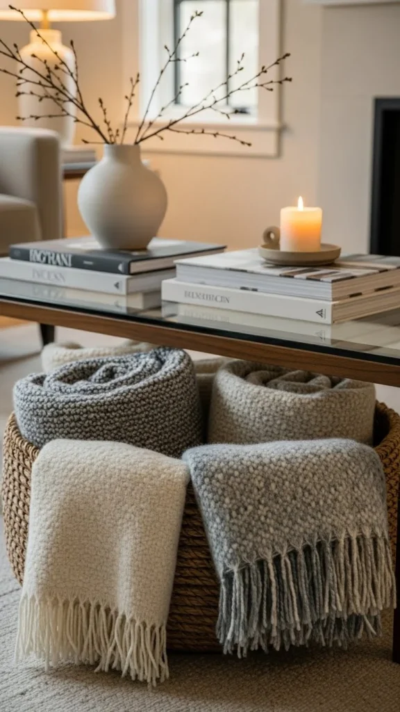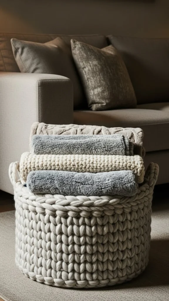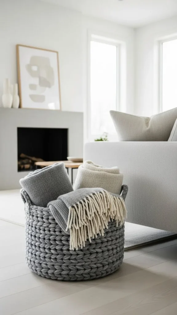 A felted wool basket next to the sofa keeps blankets easy to grab during cold evenings. Choose a medium-height basket so blankets fold neatly instead of bunching. Neutral shades like oatmeal, gray, or cream work well with most furniture.