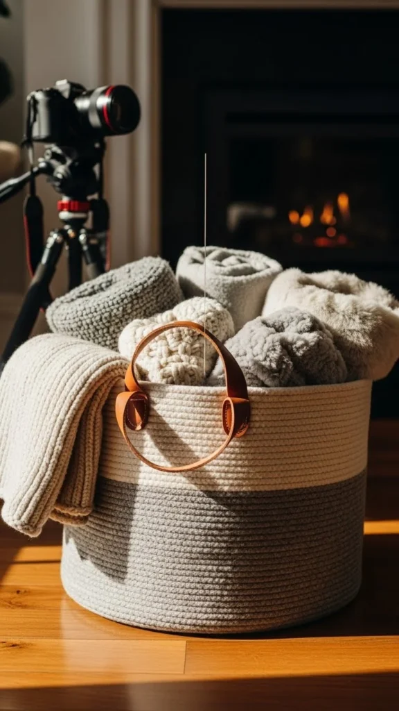4. Wool Rope Basket Near the Fireplace