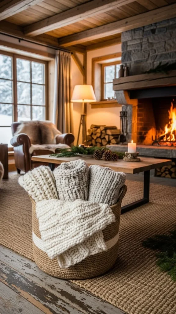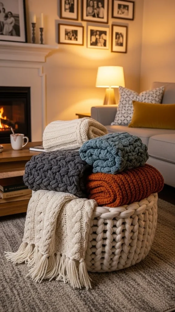 Large family rooms benefit from oversized wool baskets. They hold multiple throws for movie nights or guests. Chunky knit styles add visual weight without furniture bulk.