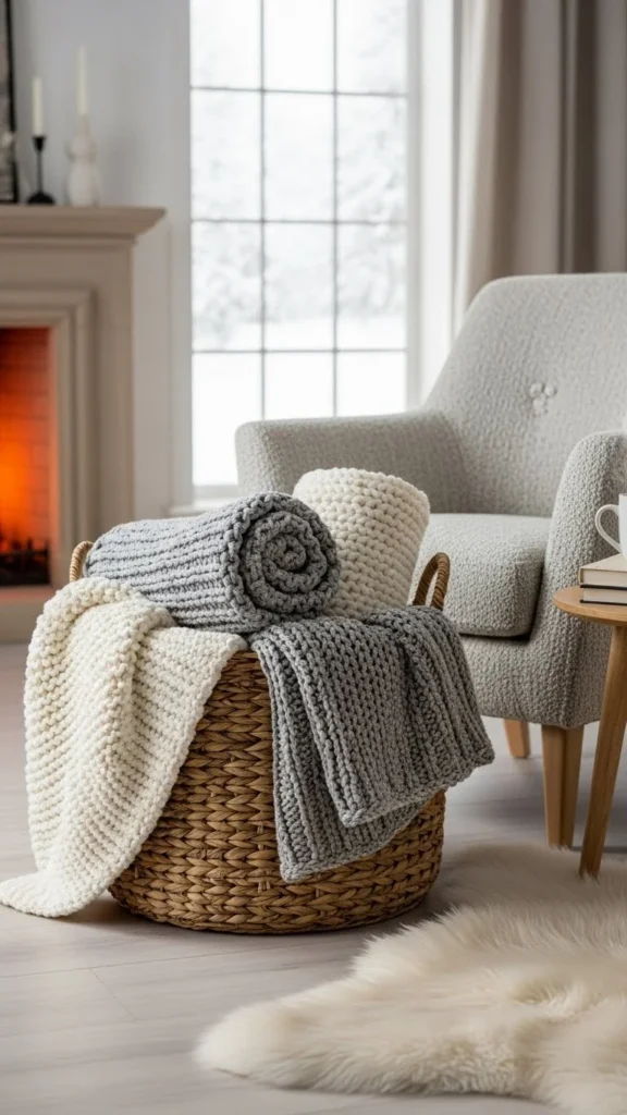 Place the basket close enough to reach without standing. Keep only two or three blankets inside so it never looks overfilled. This setup keeps the room relaxed and practical while making wool texture part of everyday decor.