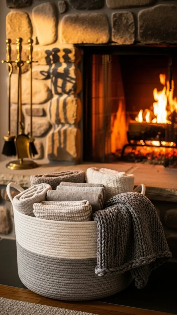Limit contents to two blankets so the basket stays upright. This keeps the hearth area cozy and clutter-free.