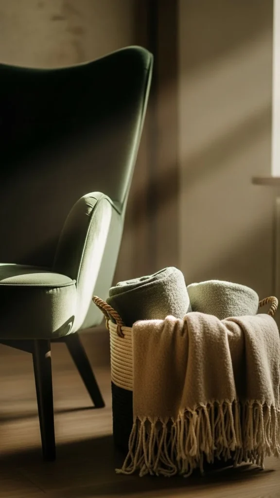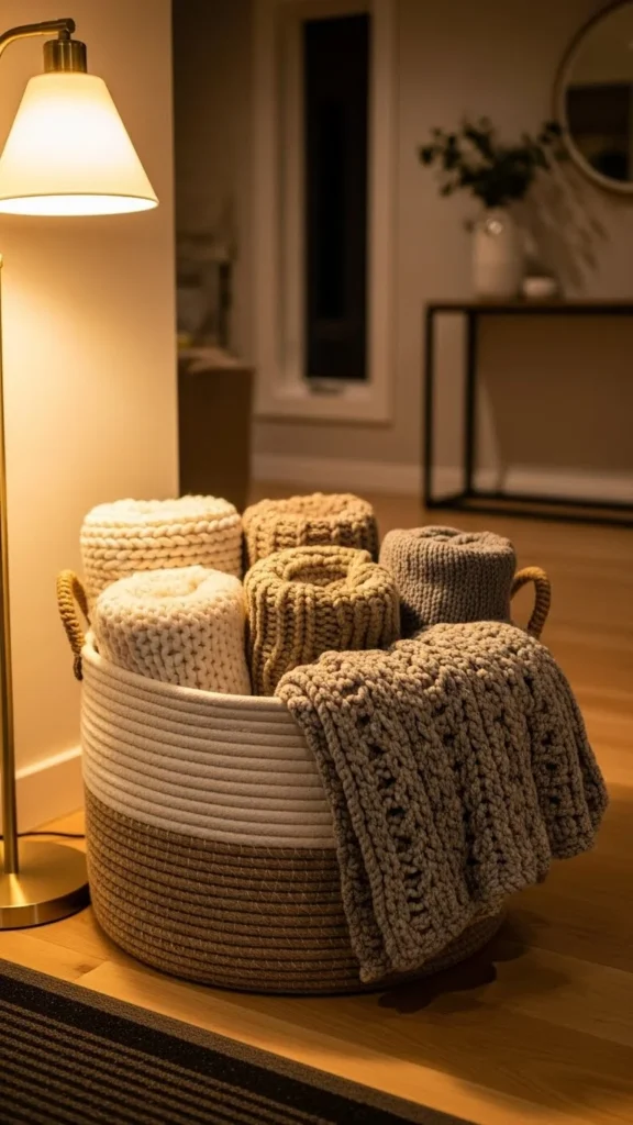Corners often go unused. A tall wool basket fits neatly into these spots while holding long throws. Choose a basket with a narrow footprint so it doesn’t crowd the room.